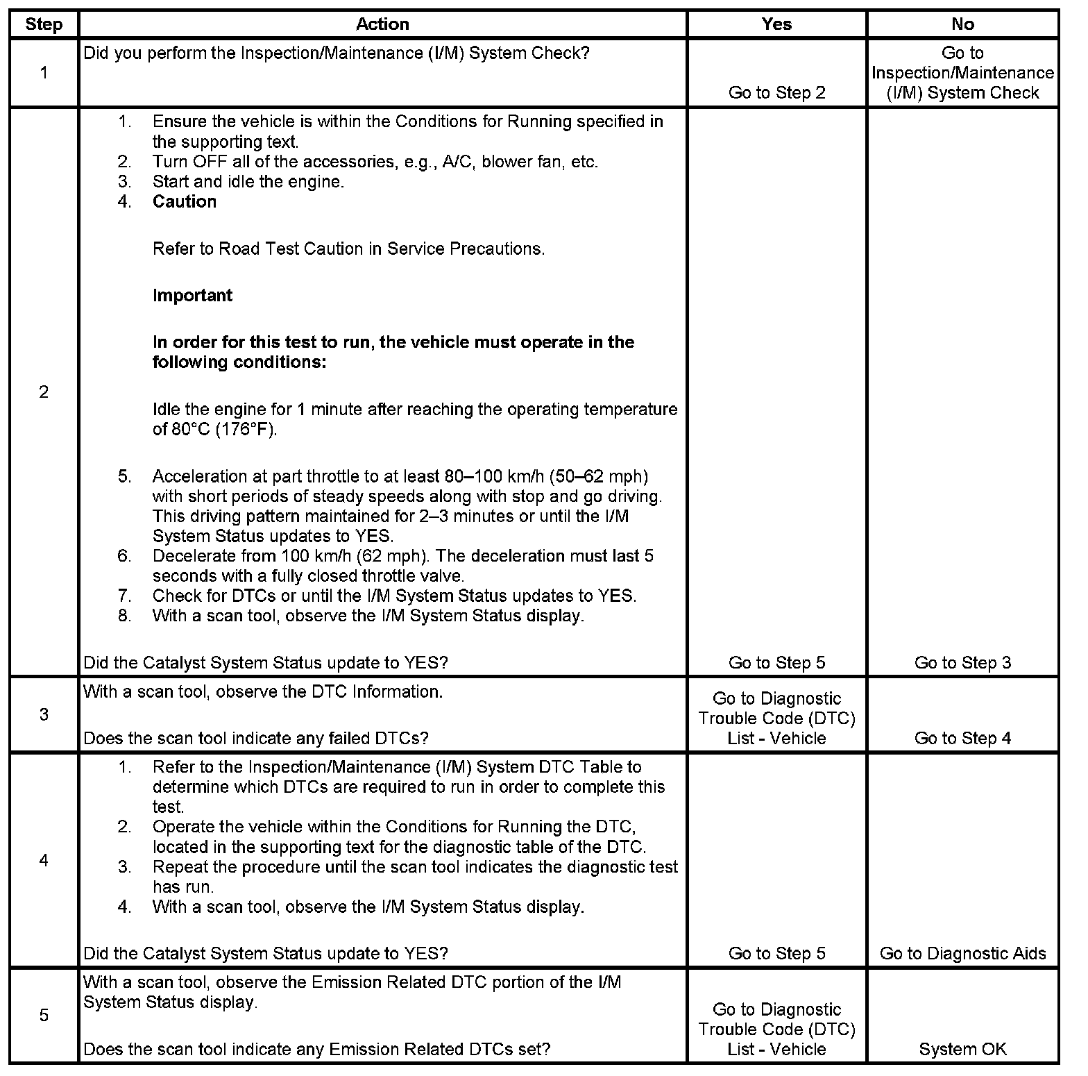 5. The I/M System Status only reports on whether or not a diagnostic has run, not what the outcome of the test was. If any Emission Related DTC sets after the tests are complete, the DTC will require diagnosis.