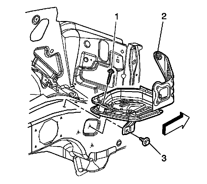 6. Remove the lower battery tray bolt (3).