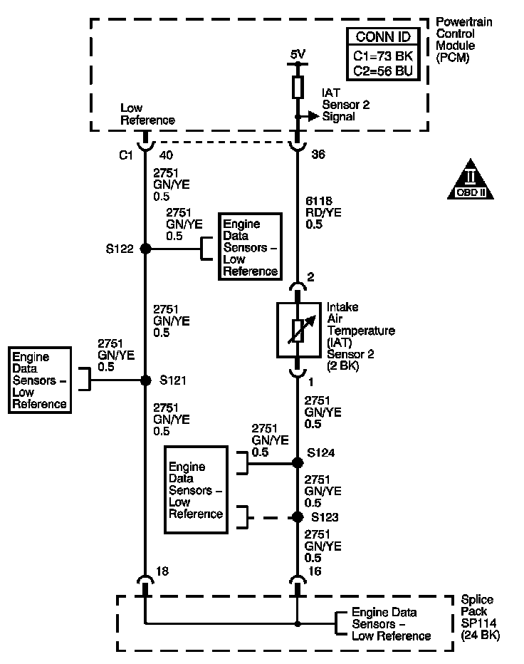 This diagnostic monitors the signal of the intake air temperature (IAT) sensor. The IAT sensor is a variable resistor that measures the temperature of the intake air. The powertrain control module (PCM) supplies 5 volts to the IAT signal circuit and supplies a ground to the low reference circuit. If the PCM detects a low IAT signal voltage, which is a high temperature indication, this DTC sets.