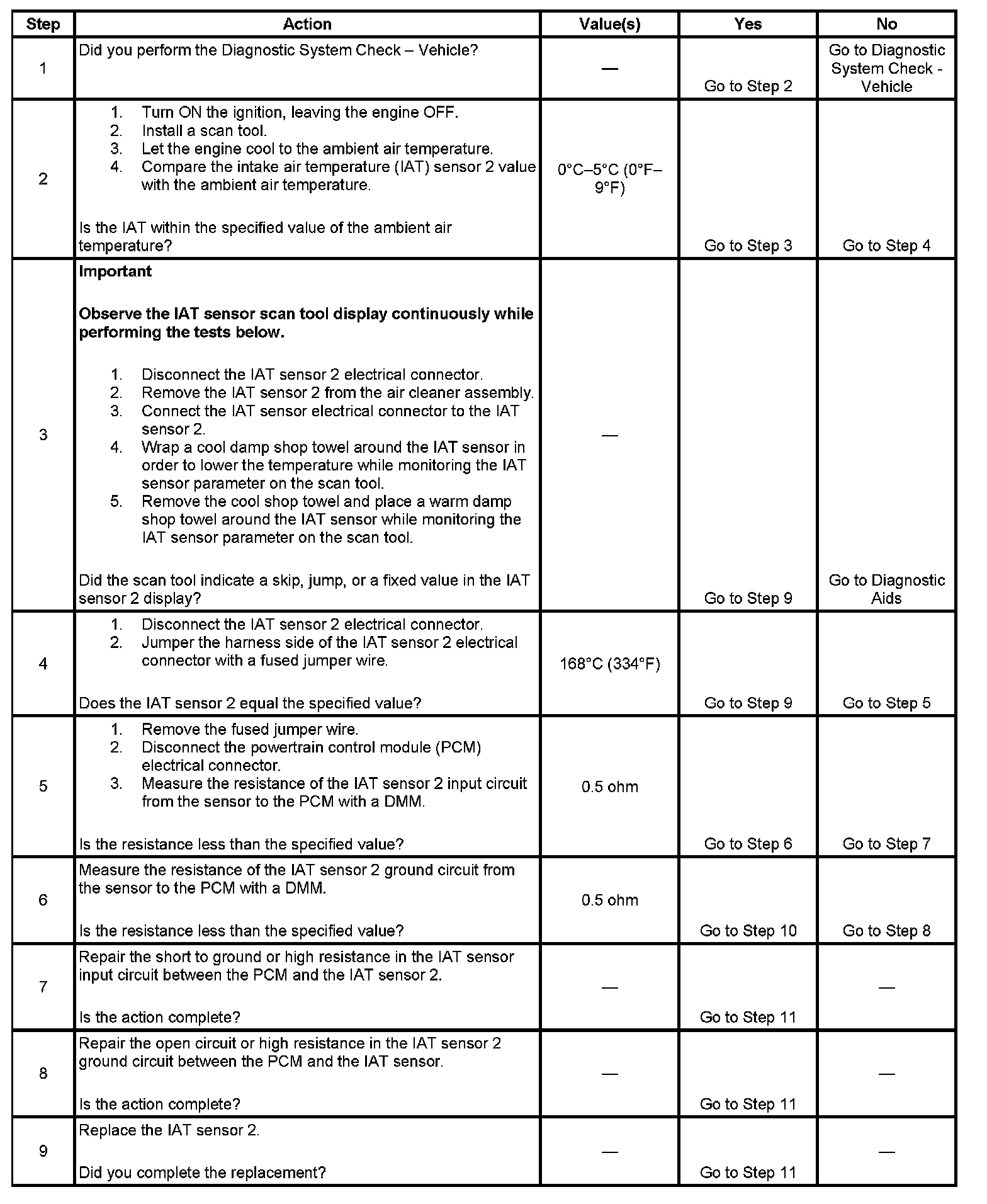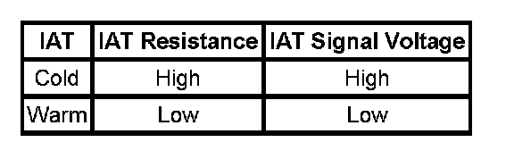 - Use the Temperature vs Resistance table in order to test the IAT sensor at various temperature levels in order to evaluate the possibility of a skewed sensor. A skewed sensor could result in a driveability concern. If the engine has sat overnight, the engine coolant temperature and the intake air temperature values should display within a few degrees. If the temperatures are not within 3°C (5°F) of each other, refer to Temperature vs Resistance - Intake Air Temperature (IAT) Sensor.