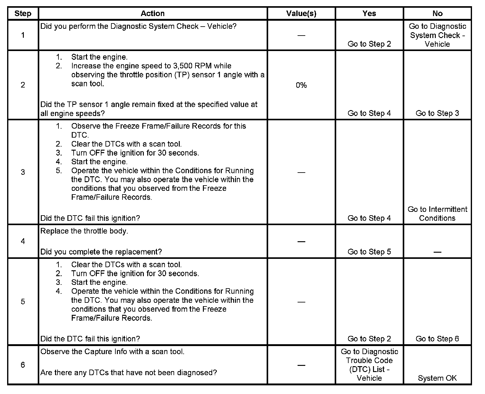 This diagnostic monitors the throttle position (TP) sensor 1 signal. There are two TP sensors located on the throttle body inside of the throttle actuator control (TAC) module. All throttle control is performed by the throttle actuator control (TAC) system. The TP sensors, along with the accelerator pedal position (APP) sensors and the TAC module are mandatory components of the TAC system. The TP sensors are used to determine the throttle plate angle. The TP sensor is a potentiometer with a resistance value that changes along with the throttle valve position. The sensor uses a 5-volt reference supply, a low reference and a signal circuit. The TAC module uses the signal circuit voltage to calculate the actual throttle valve opening. The TP sensor is an integral part of the TAC module and is not serviced separately. Installing a new TP sensor requires the replacement of the throttle body assembly. For additional information on the operation of the TP sensor and the TAC system refer to Throttle Actuator Control (TAC) System Description. If the TAC module detects that the TP sensor 1 signal voltage is too low it reports the malfunction to the powertrain control module (PCM) and the PCM sets this DTC.