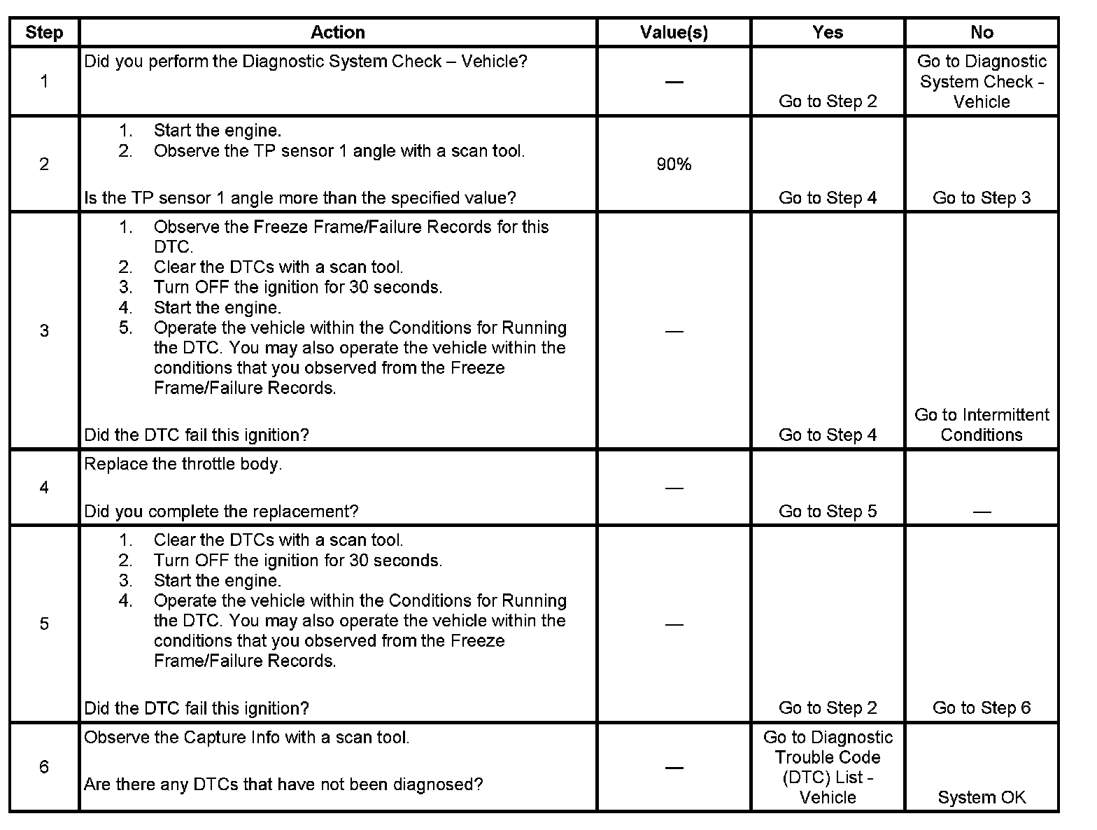 This diagnostic monitors the throttle position (TP) sensor 1 signal. There are two TP sensors located on the throttle body inside of the throttle actuator control (TAC) module. All throttle control is performed by the throttle actuator control (TAC) system. The TP sensors, along with the accelerator pedal position (APP) sensors and the TAC module are mandatory components of the TAC system. The TP sensors are used to determine the throttle plate angle. The TP sensor is a potentiometer whose resistance value changes along with the throttle valve position. The sensor uses a 5-volt reference supply, a low reference and a signal circuit. The TAC module the signal circuit voltage to calculate the actual throttle valve opening. The TP sensor is an integral part of the TAC module is not serviced separately. Installing a new TP sensor requires the replacement of the throttle body assembly. For additional information on the operation of the TP sensor and the TAC system refer to Throttle Actuator Control (TAC) System Description. If the TAC module detects that the TP sensor 1 signal voltage is too high it reports the malfunction to the powertrain control module (PCM) and the PCM sets this DTC.