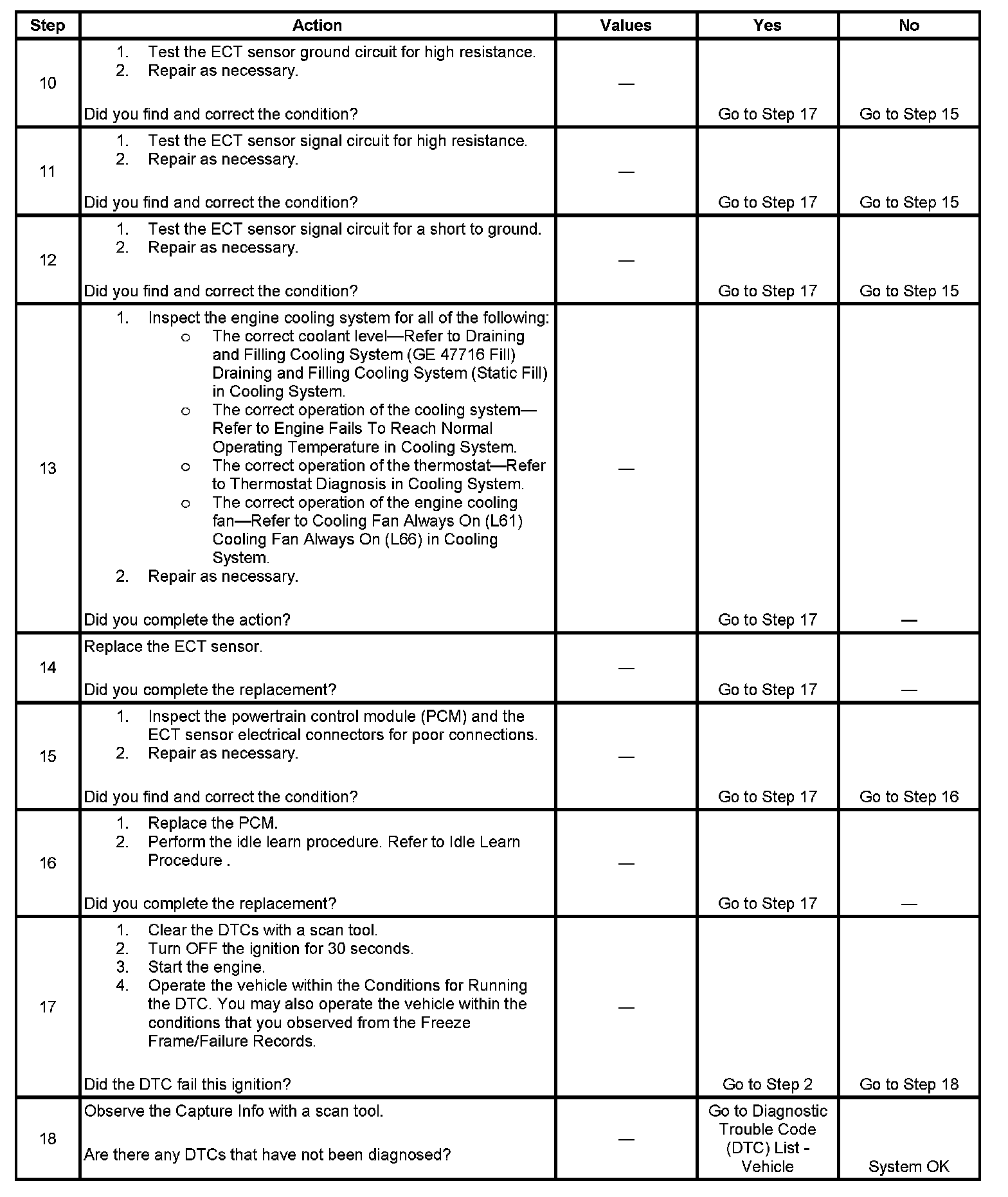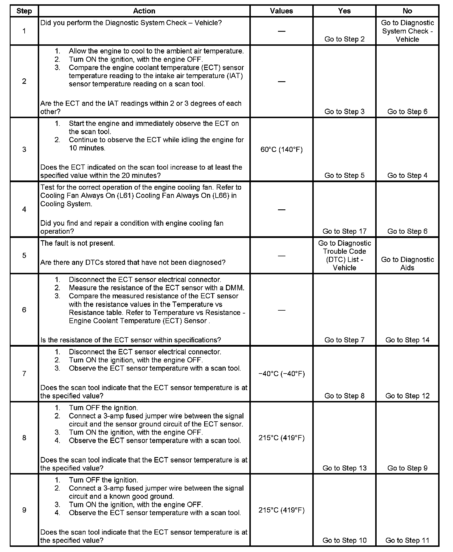 - Use the Temperature vs Resistance table in order to evaluate the possibility of a shifted ECT sensor. A shifted sensor could result in DTC P0128. Refer to Temperature vs Resistance - Engine Coolant Temperature (ECT) Sensor.