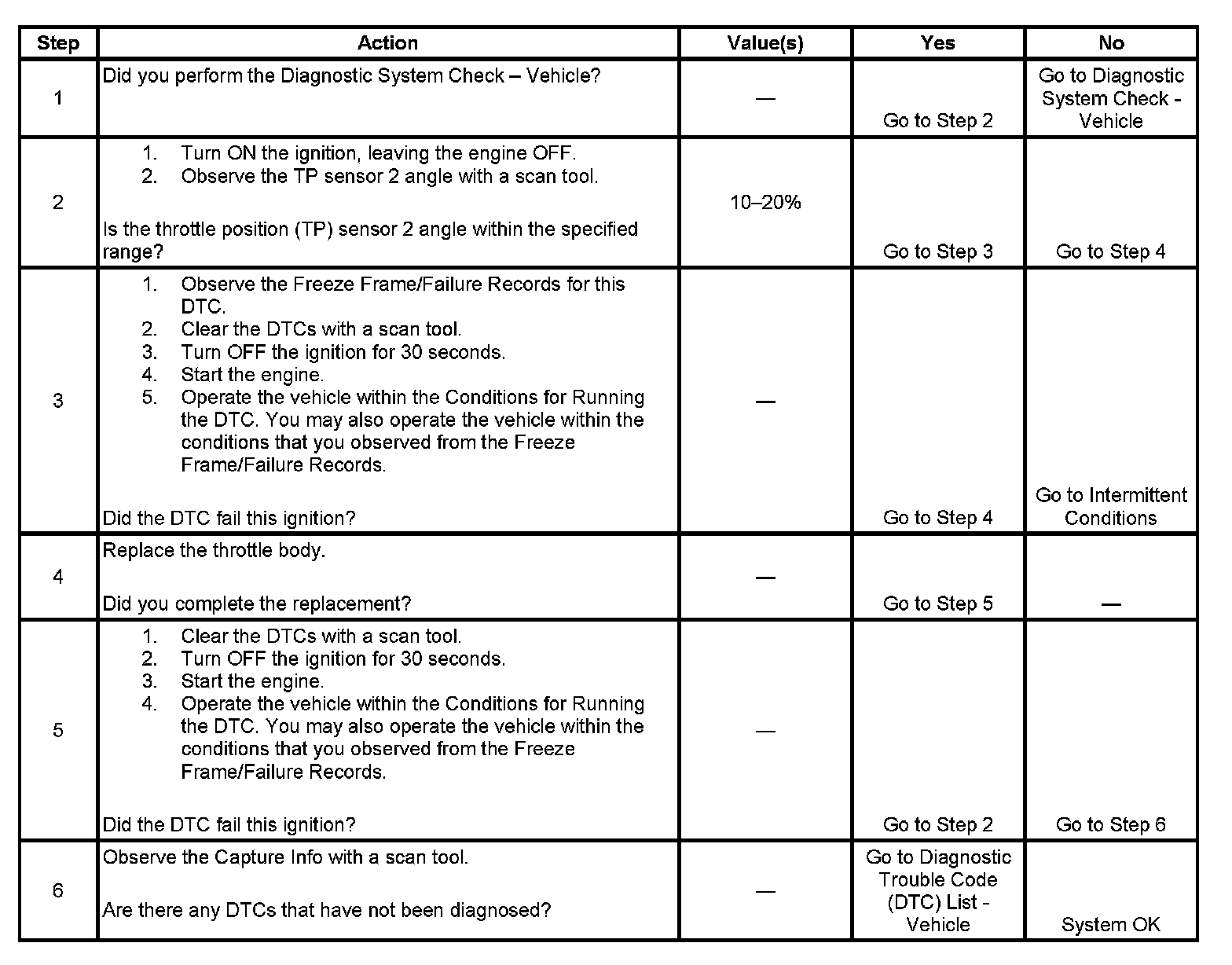 This diagnostic monitors the throttle position (TP) sensor 2 signal. There are 2 TP sensors located on the throttle body inside of the throttle actuator control (TAC) module. All throttle control is performed by the throttle actuator control (TAC) system. The TP sensors, along with the accelerator pedal position (APP) sensors and the TAC module are mandatory components of the TAC system. The TP sensors are used to determine the throttle plate angle. The TP sensor is a potentiometer whose resistance value changes along with the throttle valve position. The sensor uses a 5-volt reference supply, a low reference and a signal circuit. The TAC module the signal circuit voltage to calculate the actual throttle valve opening. The TP sensor is an integral part of the TAC module is not serviced separately. Installing a new TP sensor requires the replacement of the throttle body assembly. For additional information on the operation of the TP sensor and the TAC system refer to Throttle Actuator Control (TAC) System Description.
