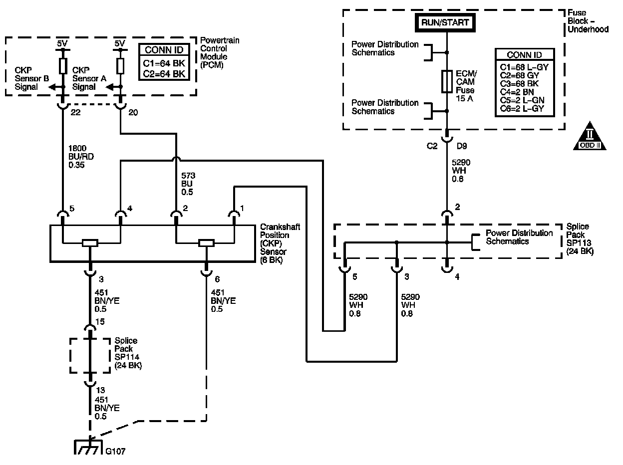 This diagnostic monitors the signal from the crankshaft position (CKP) sensor B. The CKP sensor is a magnetic generator type sensor, producing an alternating current signal. The CKP sensor signal increases in both frequency and amplitude as the engine speed increases. The CKP sensor sends this reference signal to the powertrain control module (PCM) to indicate the crankshaft speed and position. This reference signal is used by the PCM to calculate fuel injection pulse, establish top dead center (TDC) for ignition timing and where to start ignition coil and injection sequencing. There will be no spark or fuel delivery if there is no CKP sensor signal from either CKP sensor.