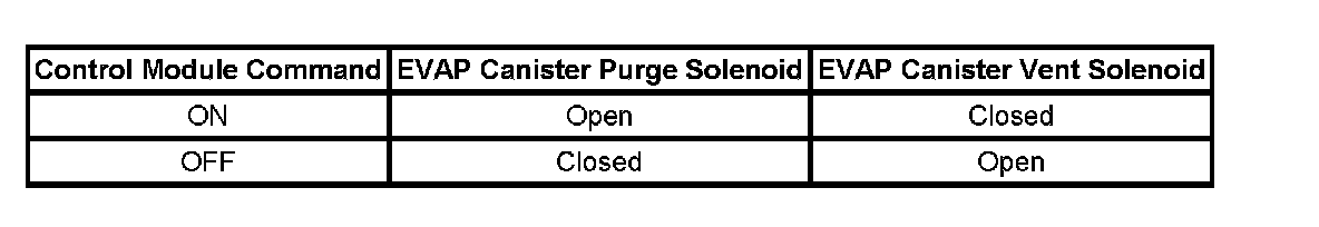 The table illustrates the relationship between the ON and OFF states, and the Open or Closed states of the EVAP canister purge and vent valves.
