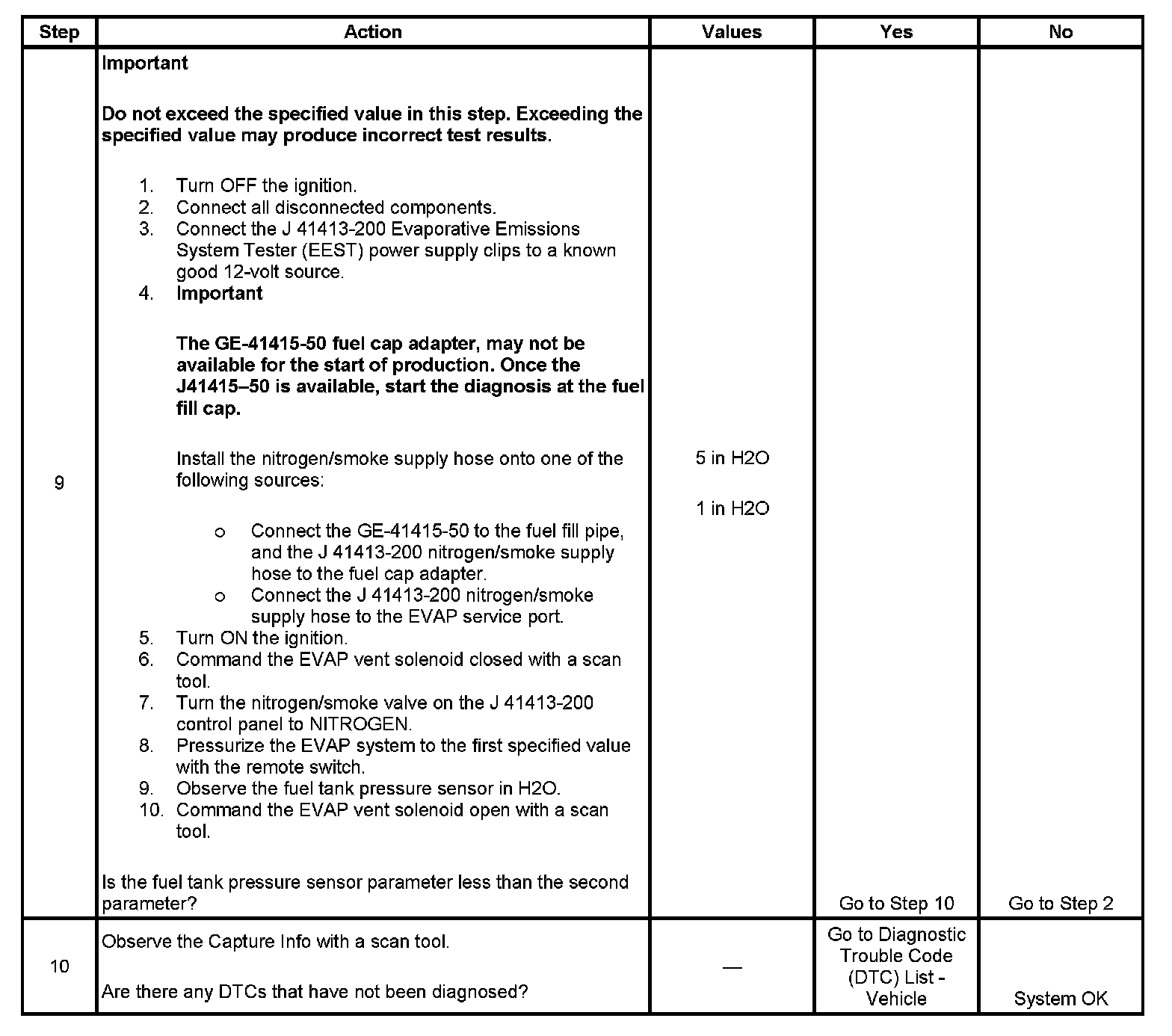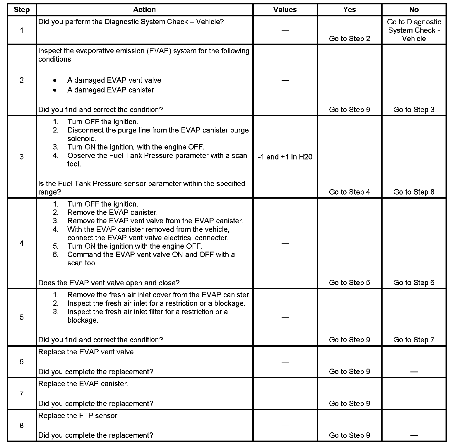 This diagnostic monitors the evaporative emission (EVAP) system for a restricted or blocked EVAP vent system. The control module commands the EVAP canister purge solenoid Open and the EVAP canister vent solenoid Closed. This allows vacuum to be applied to the EVAP system. Once a calibrated vacuum level has been reached, the control module commands the EVAP canister purge solenoid Closed and the EVAP canister vent solenoid Open. The control module monitors the fuel tank pressure (FTP) sensor for a decrease in vacuum. If the vacuum does not decrease to near 0 inches H2O in a calibrated time, this DTC sets.
