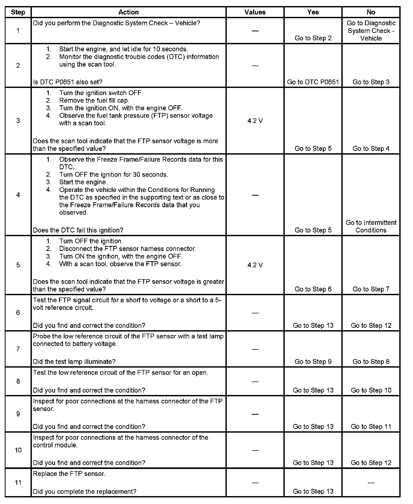 The DTC P0453 Fuel Tank Pressure (FTP) Sensor Circuit High Voltage diagnostic monitors the function of the FTP sensor circuit. The control module monitors the FTP sensor signal in order to detect vacuum decay and excess vacuum during the evaporative emission (EVAP) diagnostic test. The control module supplies a 5-volt reference and a low reference circuit to the FTP sensor. If the control module detects the FTP sensor signal voltage above a calibrated value, this DTC will set.