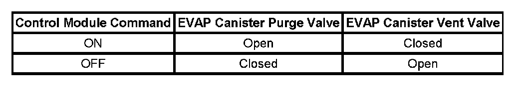 The table illustrates the relationship between the ON and OFF states, and the OPEN or CLOSED states of the EVAP canister purge and vent valves.