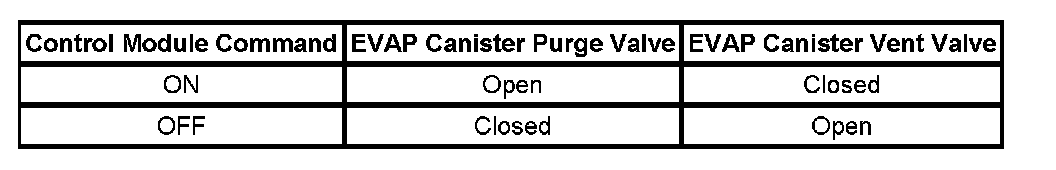 The table illustrates the relationship between the ON and OFF states, and the Open or Closed states of the EVAP canister purge and vent valves.