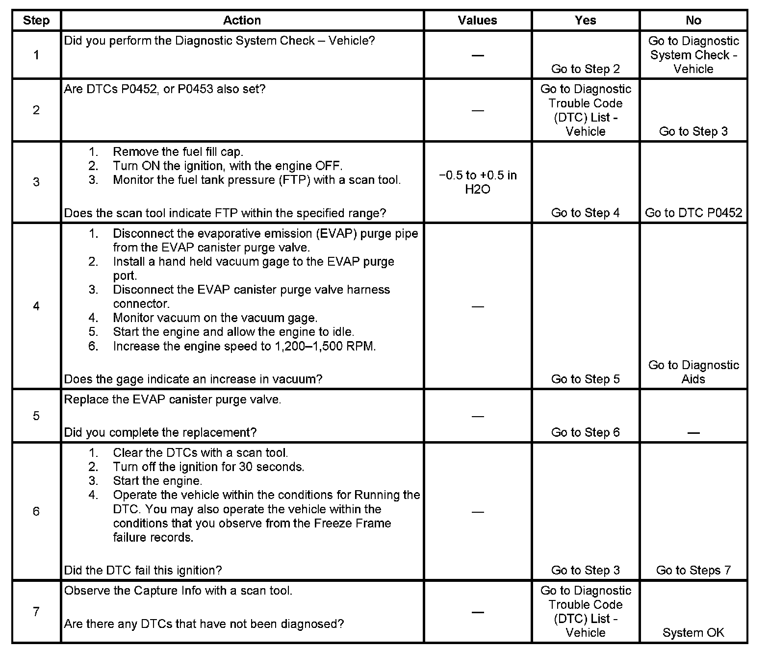 This diagnostic monitors the evaporative emission (EVAP) system for the correct operation of the purge solenoid. The control module seals the EVAP system by commanding the EVAP canister purge valve Closed and the EVAP canister vent valve Closed. The control module monitors the fuel tank pressure (FTP) sensor in order to determine if a vacuum is being drawn on the EVAP system. If vacuum in the EVAP system is more than a predetermined value within a predetermined time, this DTC sets.