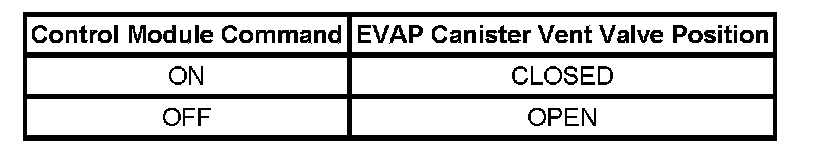 The table illustrates the relationship between the ON and OFF states, and the OPEN or CLOSED states, of the EVAP canister vent valve.