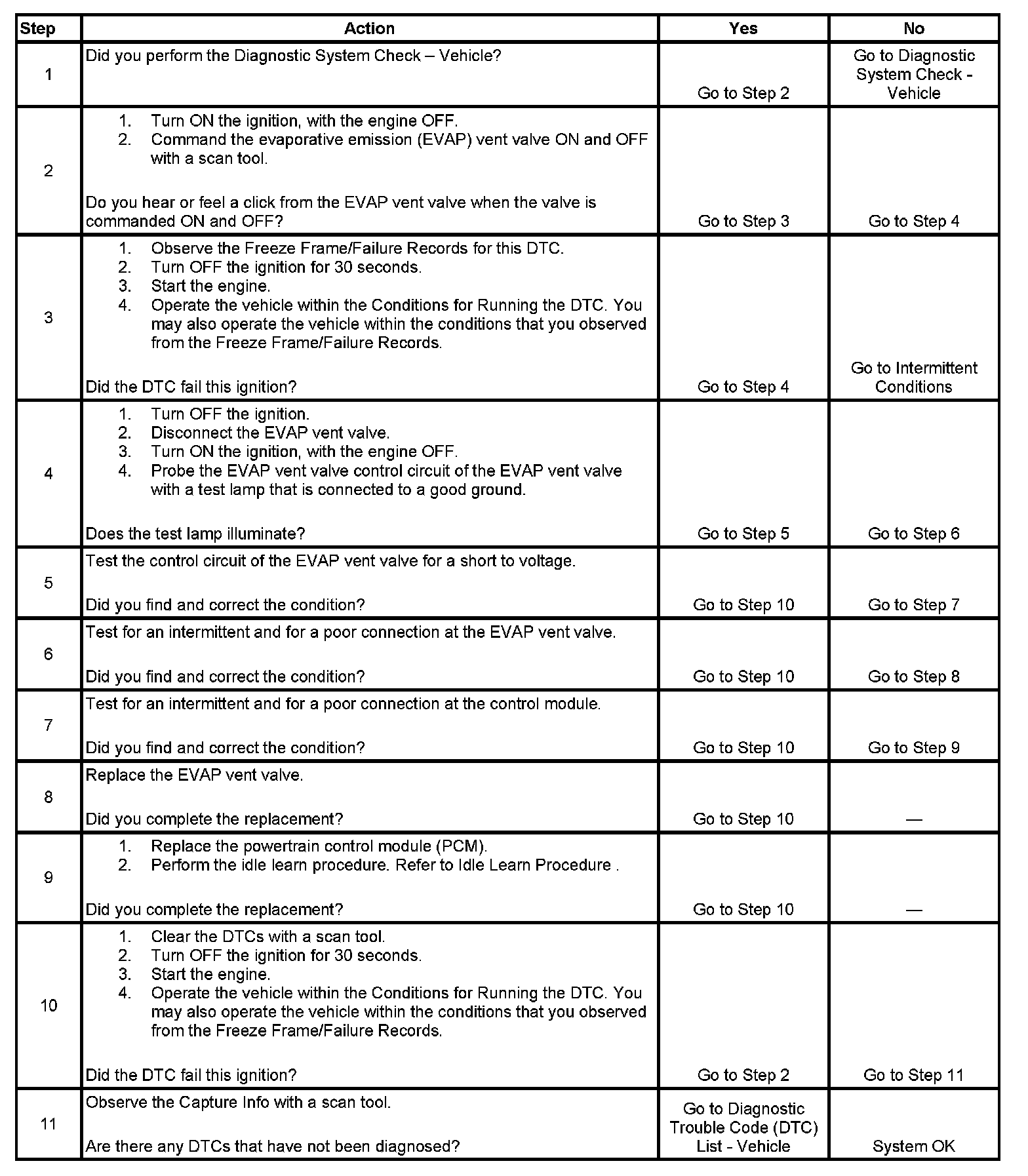 This diagnostic monitors the evaporative emission (EVAP) system for faults in the EVAP vent solenoid electrical circuit. Battery positive voltage is supplied to the evaporative emission (EVAP) canister vent valve. The control module grounds the EVAP canister vent valve control circuit to close the valve by means of an internal switch called a driver. The scan tool displays the commanded state of the EVAP canister vent valve as ON or OFF. The control module monitors the status of the driver. If the control module detects voltage on the control circuit when the driver is commanded ON, this DTC sets.