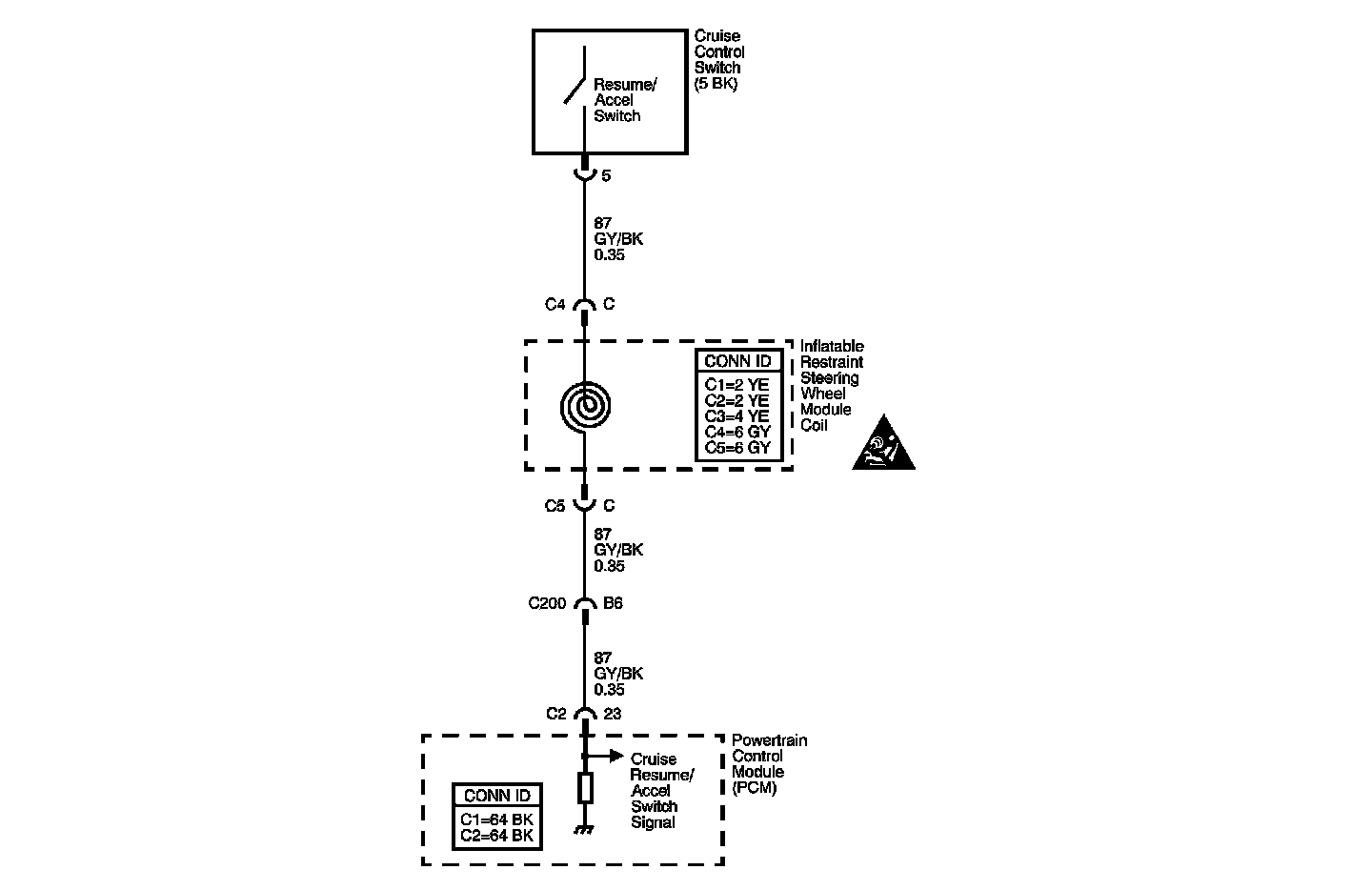 The cruise control resume/accel switch is an input to the powertrain control module (PCM). The PCM uses the cruise control resume/accel switch signal circuit in order to detect when the driver has requested to accelerate the set vehicle speed or to resume the cruise control system. The PCM detects a high signal voltage on the cruise control resume/accel switch signal circuit when the switch is applied.