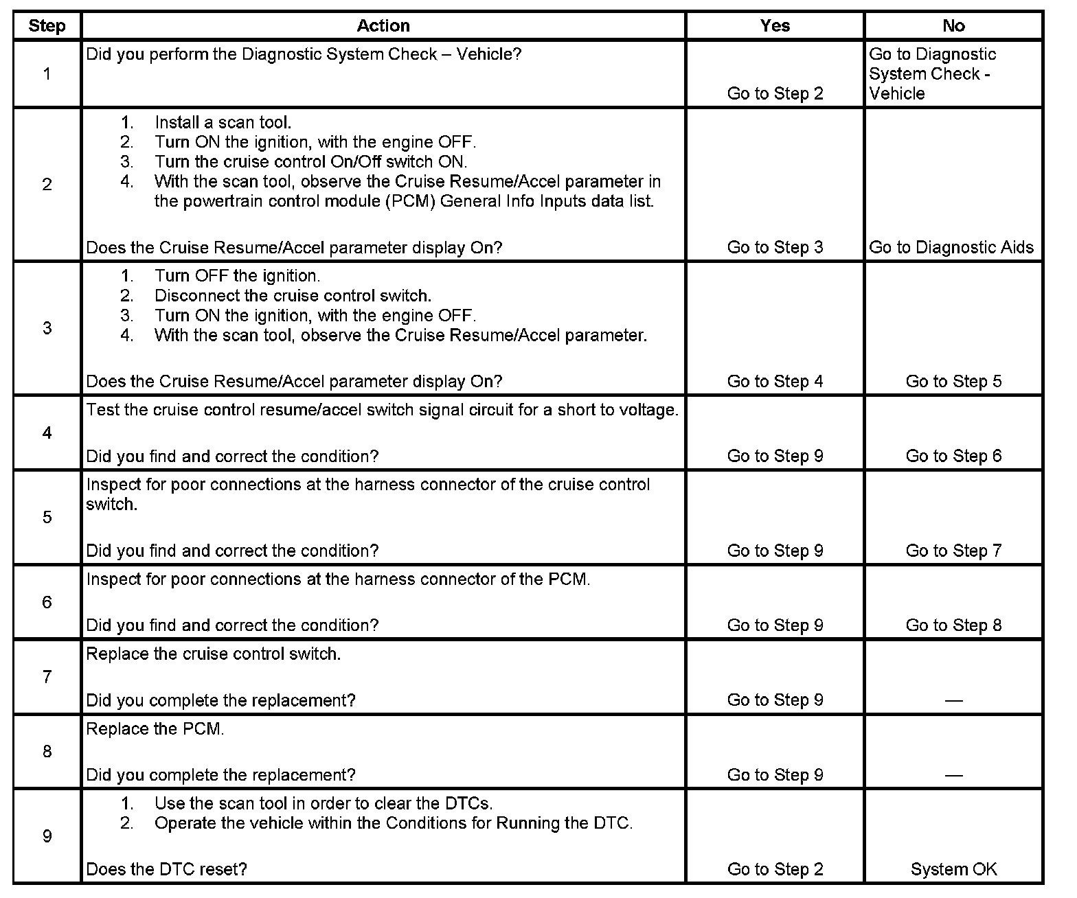 The PCM detects a high signal voltage on the cruise control resume/accel switch signal circuit for longer than 60 seconds.