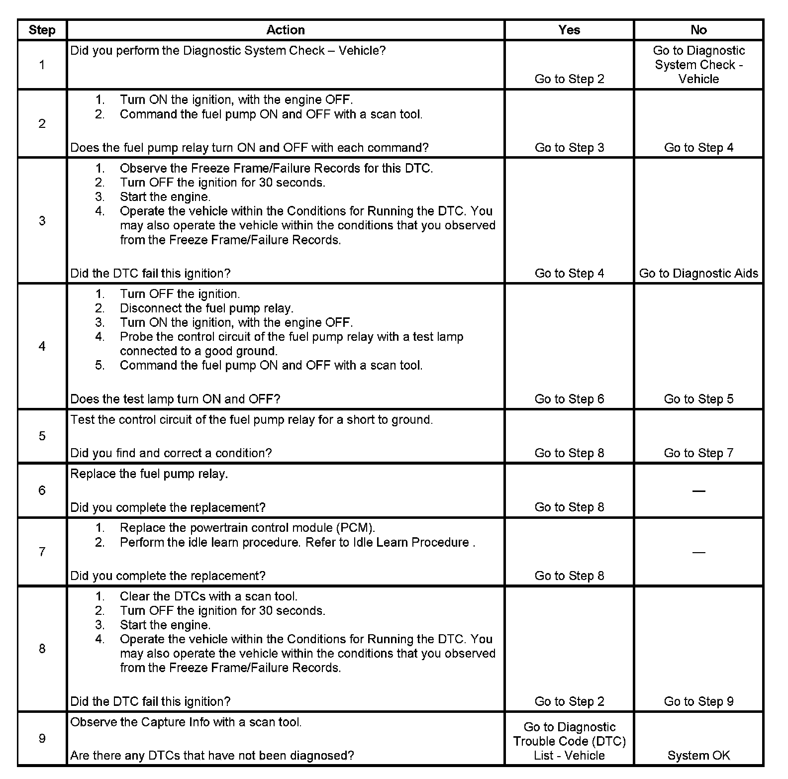 The DTC P0628 Fuel Pump Relay Control Circuit Low Voltage diagnostic detects an incorrect voltage on the coil control circuit. The fuel pump relay is controlled by the powertrain control module (PCM). The PCM energizes the relay coil for 2 seconds when the ignition switch is first turned ON and when ignition system reference pulses are detected. The fuel pump relay supplies ignition positive voltage to the fuel pump.