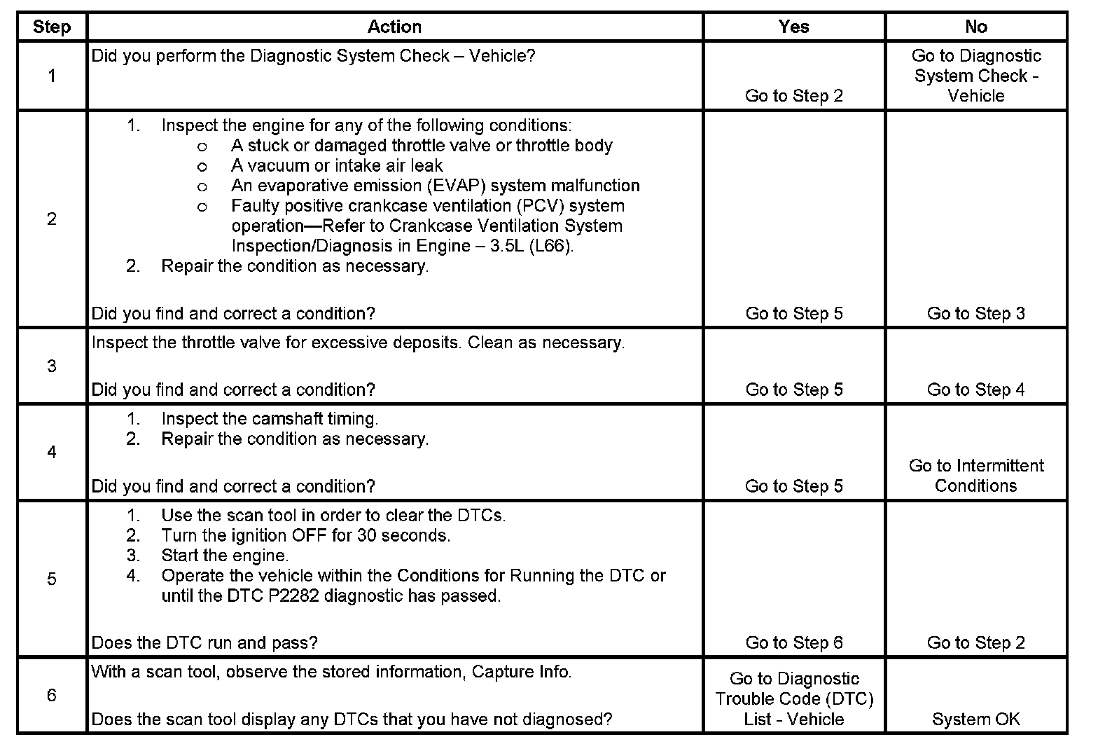 2. This step prompts the technician to check for any condition that can allow air to enter the engine. Any condition that can affect the idle speed of the engine must be repaired first, in order to enable proper diagnosis of the DTC P2282.