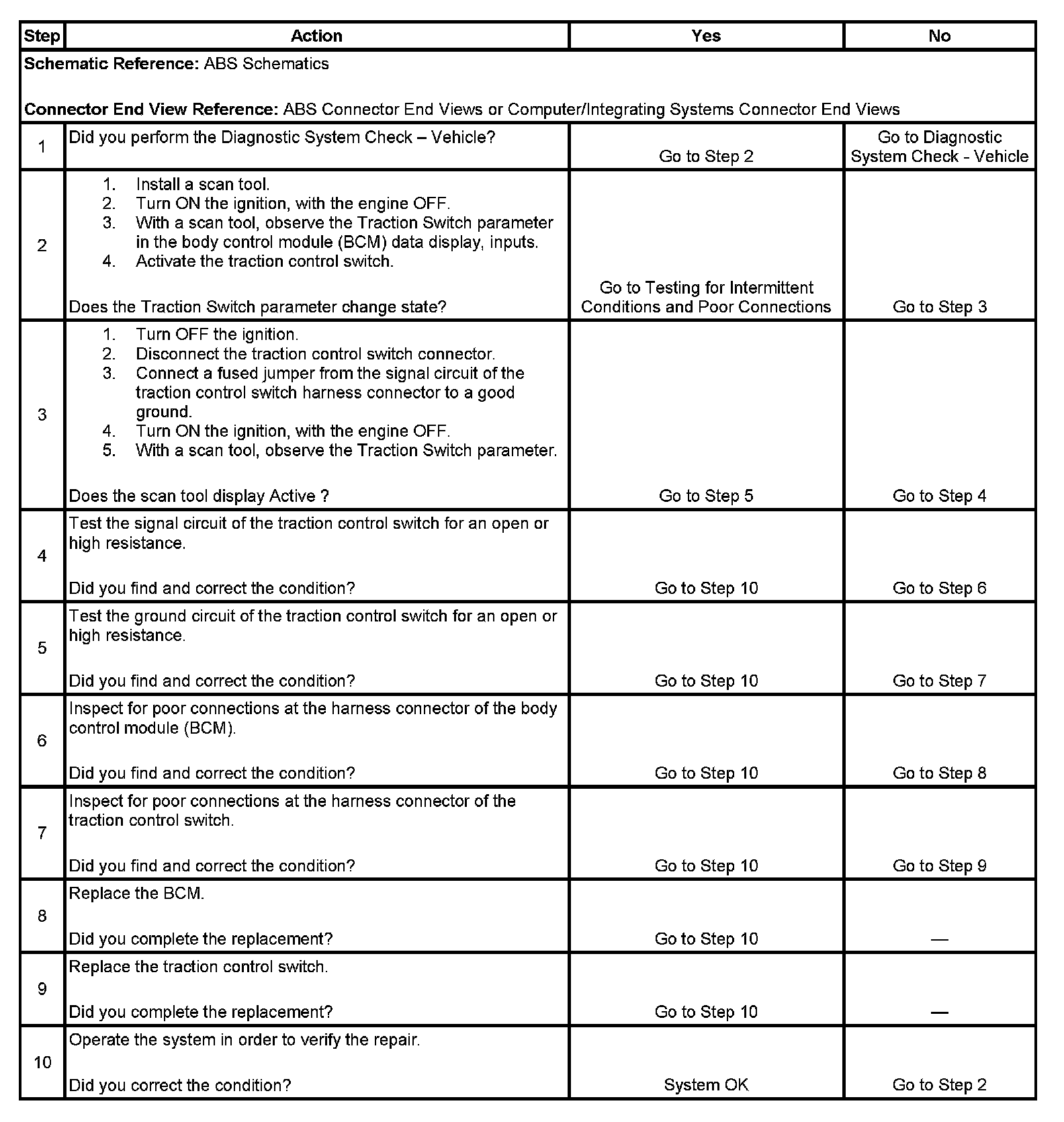 The TRAC OFF indicator is controlled by the instrument cluster via class 2 serial data messages from the electronic brake control module (EBCM). When the body control module (BCM) sees the traction control switch input grounded through the momentary traction control switch, it sends a class 2 message to the EBCM that tells the EBCM that the traction control switch has been pressed. The EBCM then disables traction control and sends a message to the instrument cluster to turn the TRAC OFF indicator ON. Each time the ignition is cycled from OFF to ON, the traction control system is enabled.