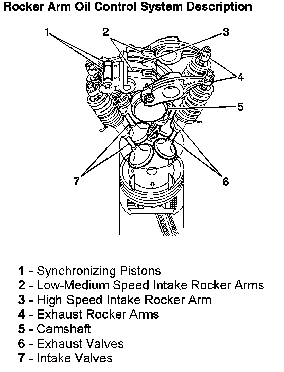 The three intake rocker arms (2 and 3) ride on rocker arm shafts as do the two exhaust rocker arms (4). The rocker arm shafts supply engine oil to the rocker arms. When the flow of oil to the rocker arms increases, the synchronizing pistons (1) move and lock the three rocker arms together. With all three rocker arms locked together, the high speed cam lobe opens and closes the intake valves (7).