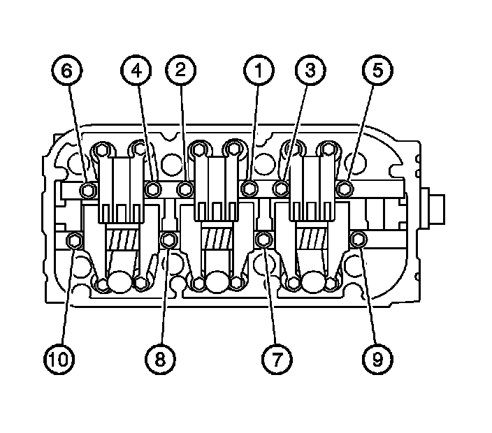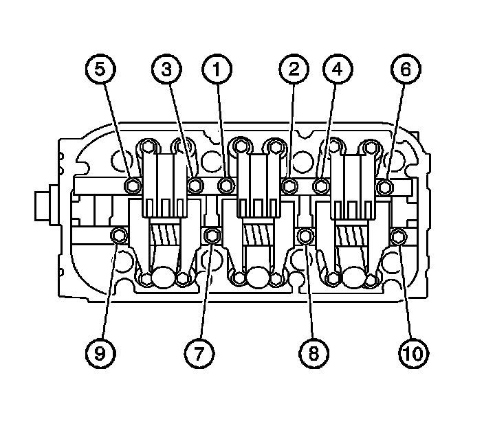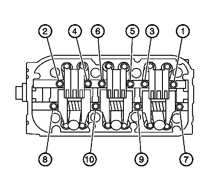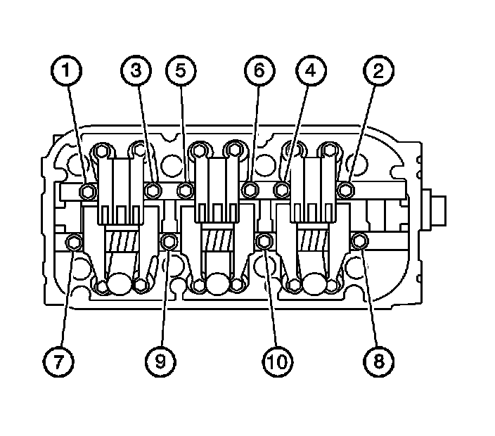 10. Tighten the right side rocker shaft retaining bolts in sequence. Tighten the bolts 2 turns at a time in sequence, to ensure that the rocker arms do not bind on the valves.