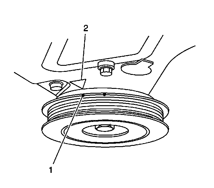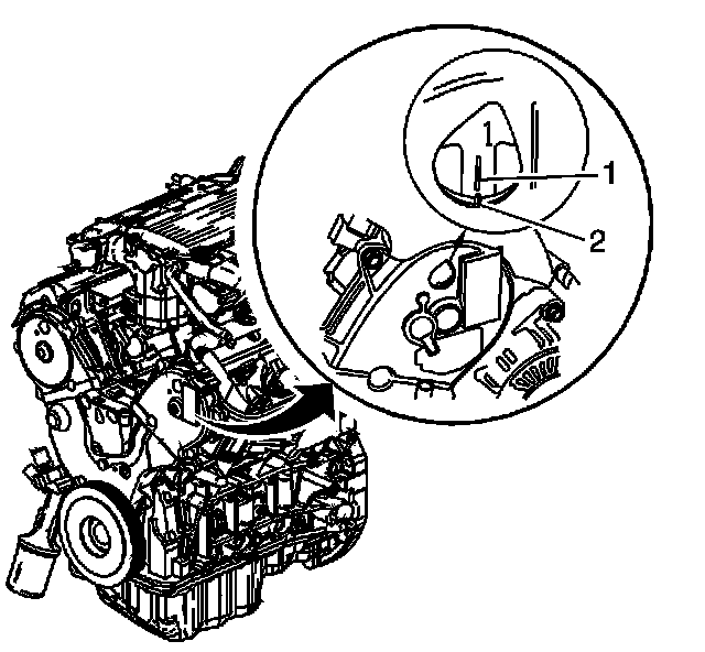 9. With the engine rotated and positioned with number 1 piston at TDC, the alignment mark on the crankshaft balancer (1) will also be aligned with the pointer (2) on the front cover.