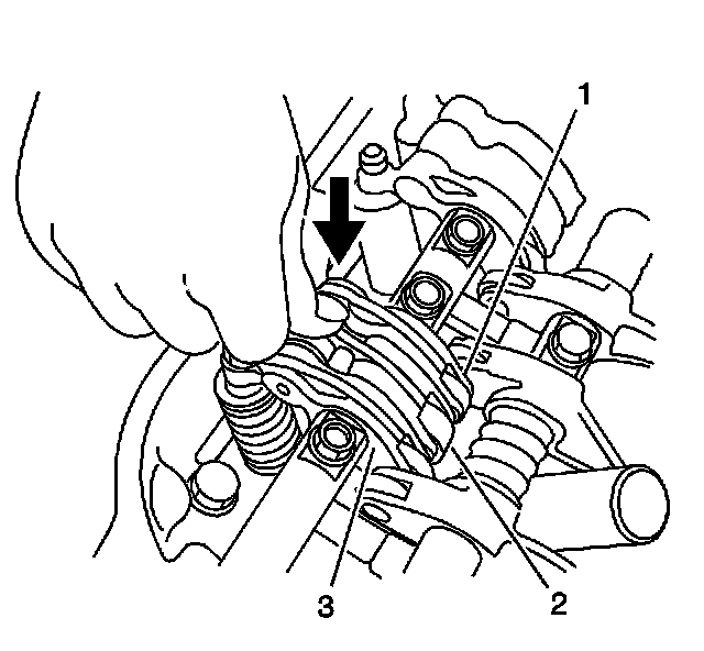 10. Push on the intake mid rocker arm (2) for the number 1 cylinder. The mid rocker arm should move independently of the primary (1) and secondary (3) rocker arms.
