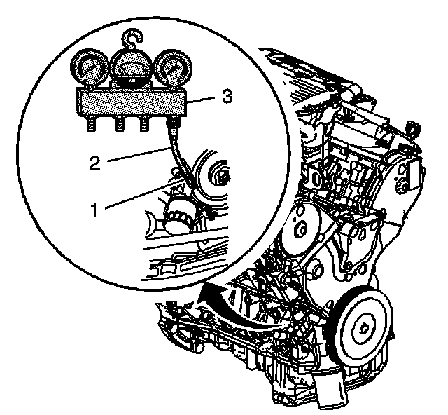 3. Remove the engine oil pressure switch and install the EN 46333 (1), flexible hose (2) and the SA9127E (3).