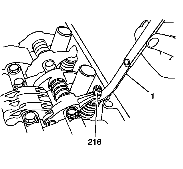 6. Insert a feeler gage (1) between the adjusting screws (216) and the ends of the valve stems for cylinder number 1. Slide the feeler gage back and forth, adjusting the screws, until you feel a slight amount of drag. If you feel too much drag, loosen the locknut and turn the adjusting screw (216) until the drag on the feeler gage is correct.