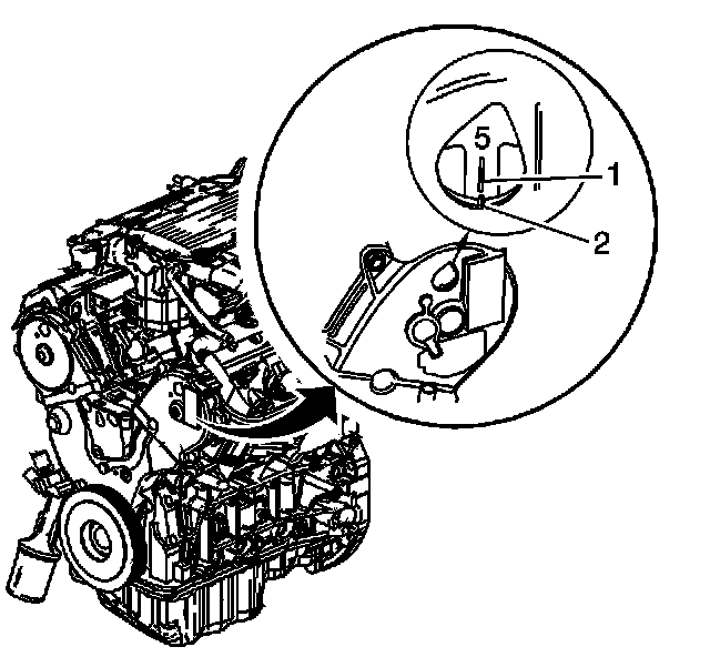 12. Rotate the engine and position number 5 piston at TDC. Align the mark (2) on the front cover with the TDC mark (1) on the sprocket.