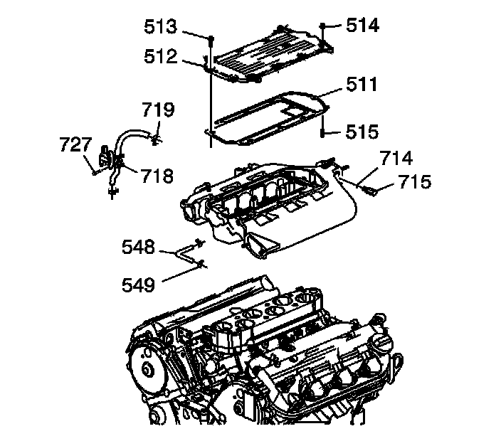 12. Install the EVAP valve (718), with hoses, clamps (719) and bolts (727).