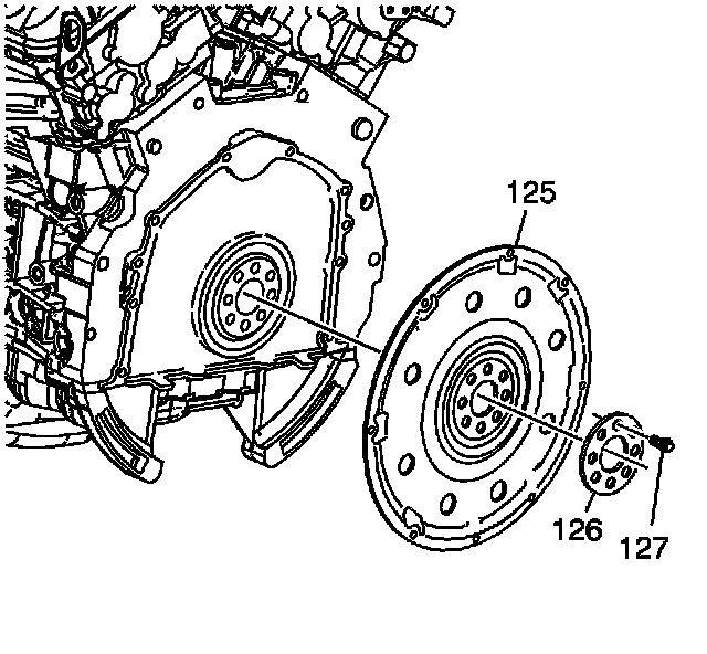 Install the flywheel (125), washer (126) and bolts (127).