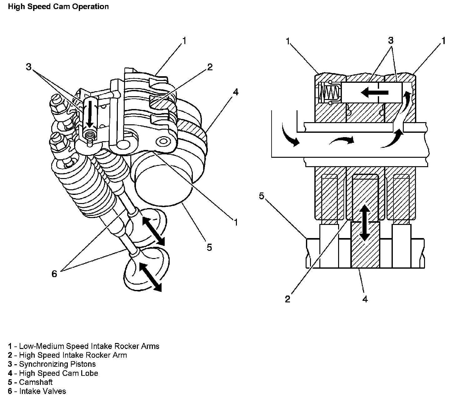 When engine speed exceeds 4,400 RPM engine oil is allowed to flow unobstructed to the rocker arms. This flow of oil into the rocker arm oil passages creates an increase in oil pressure. The increase in oil pressure moves the synchronizing pistons (3) further into their bores, compressing the piston spring. As the spring is compressed, the shifted pistons lock all three rocker arms together (1 and 2). When locked together, the low-medium speed rocker arms (1) follow the movement of the high speed rocker arm (2). Because the high speed rocker arm (2) is following the high speed cam lobe (4), the intake valves (6) open with more lift.