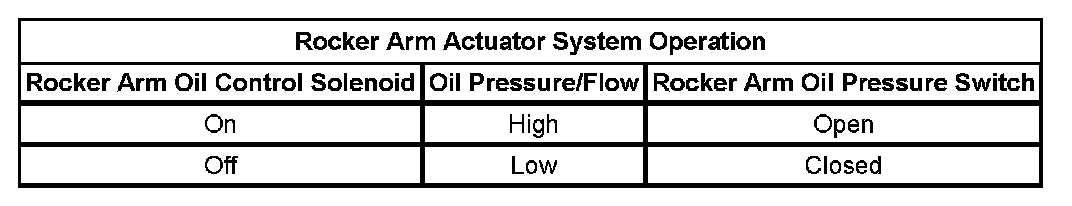 The rocker arm oil control system is an electronically controlled, hydraulically operated system that provides good low speed torque and high speed horsepower. The engine control module uses an electronic solenoid to control the flow of oil to the rocker arms. In order to determine when to transition from low to high speed operation, the control module relies on the following information: