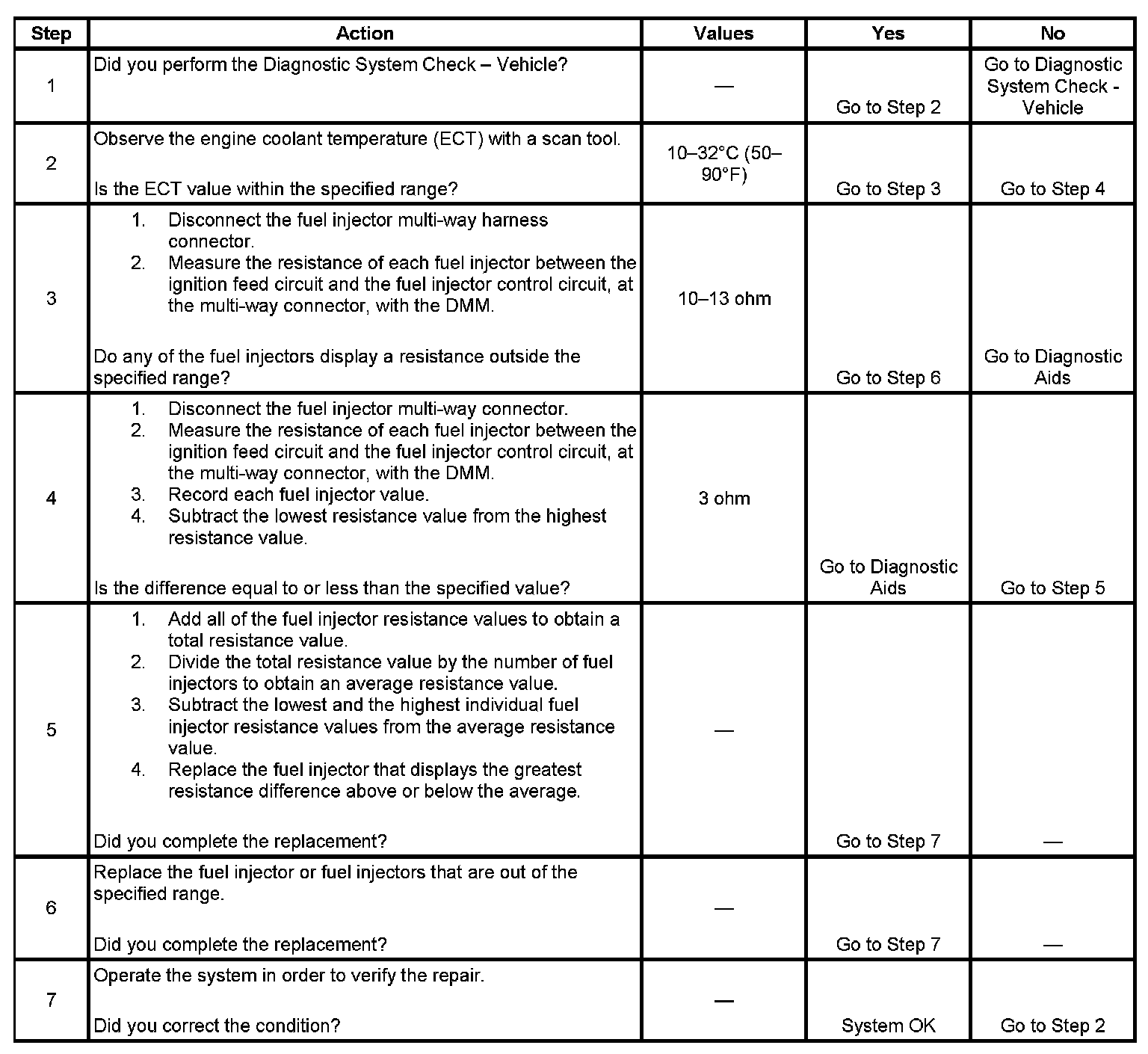 3. This step tests each fuel injector resistance within a specific temperature range. If any of the fuel injectors display a resistance outside of the specified value, replace the fuel injector.