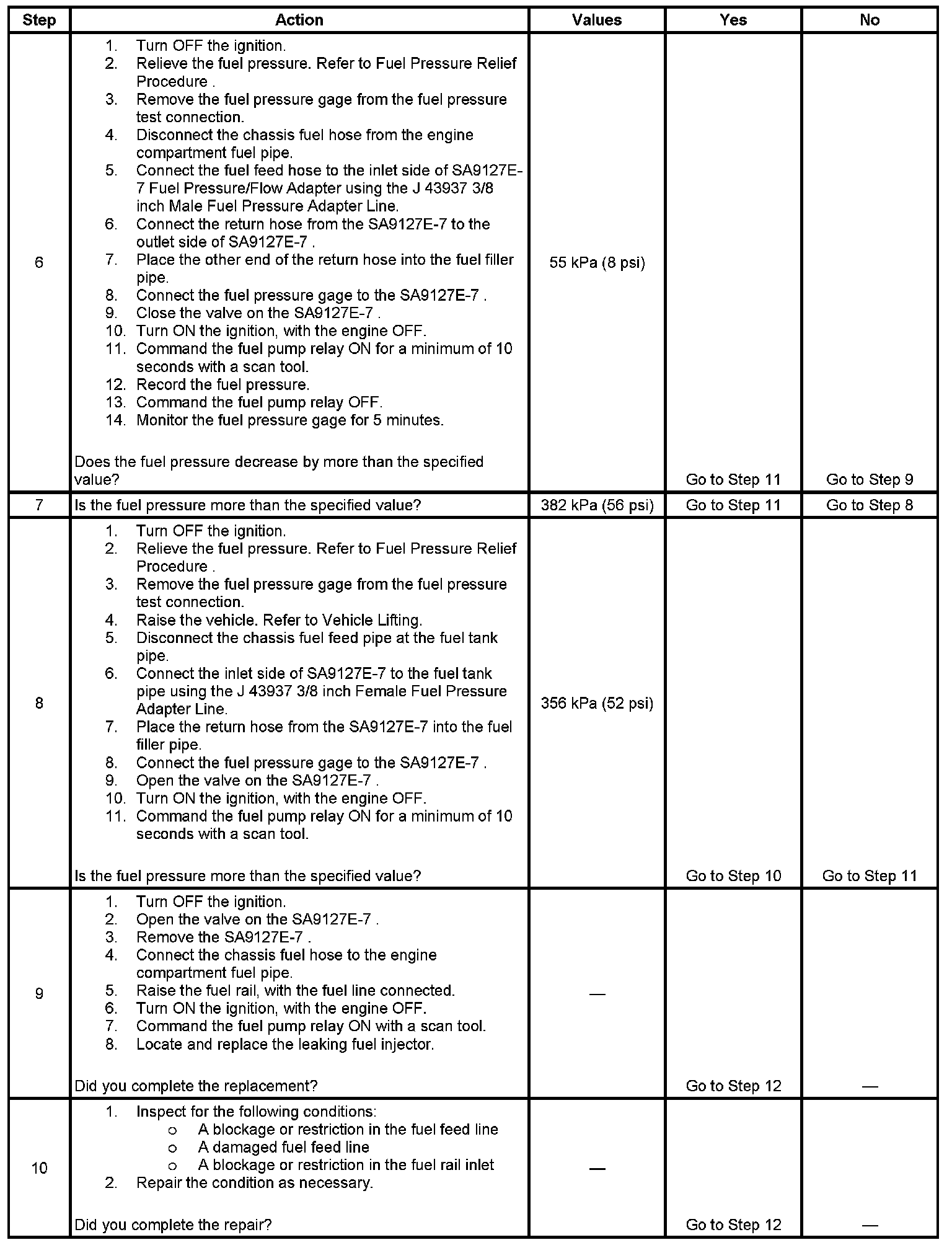 7. This step tests the operation of the fuel pressure regulator. If the fuel pressure exceeds the specified value, the fuel pressure regulator is faulty.