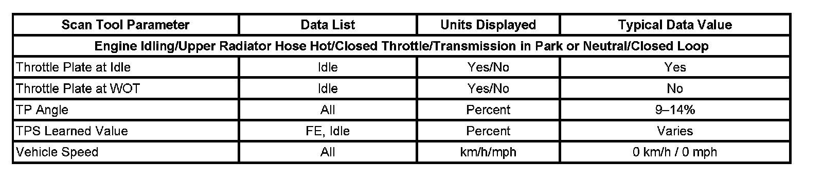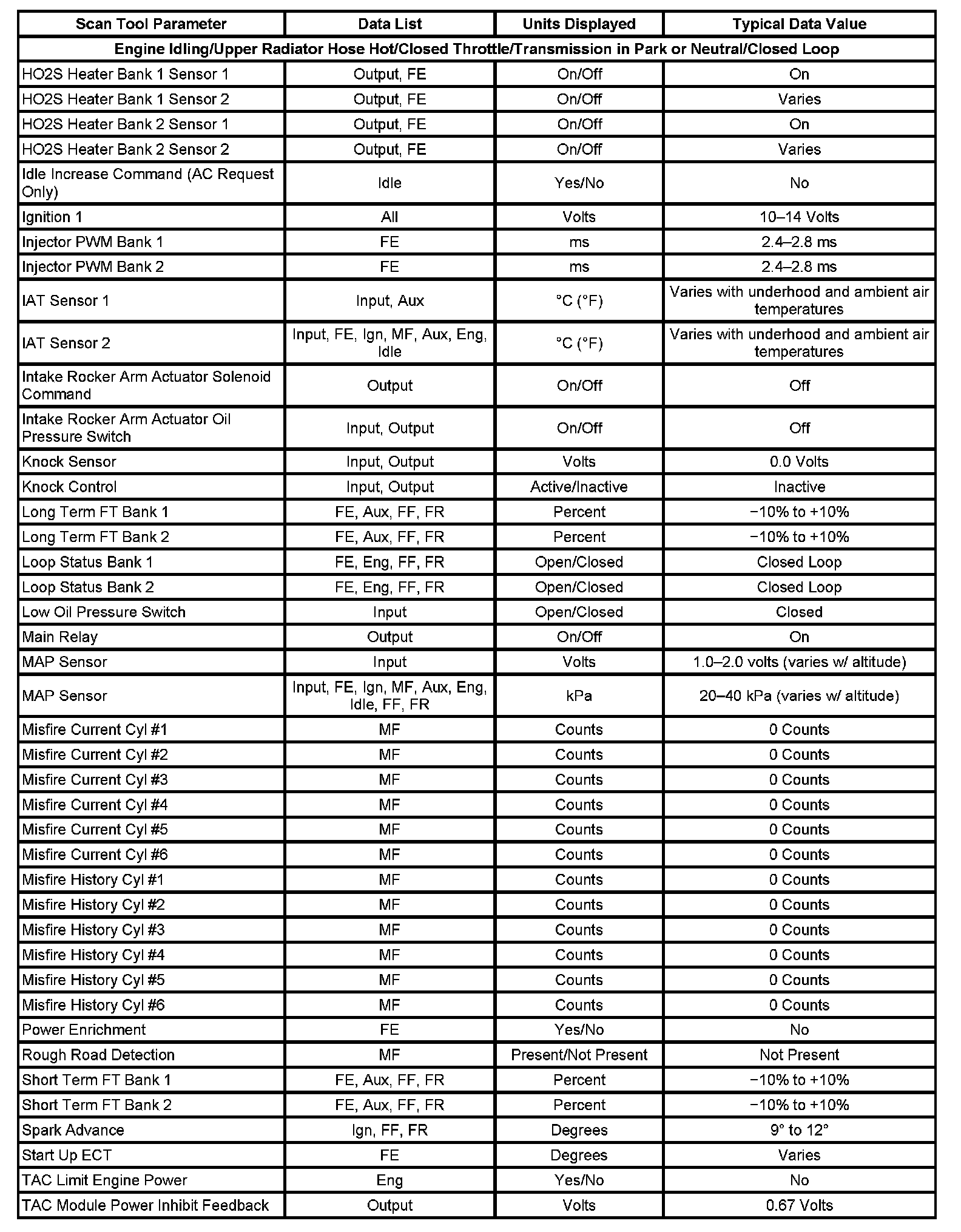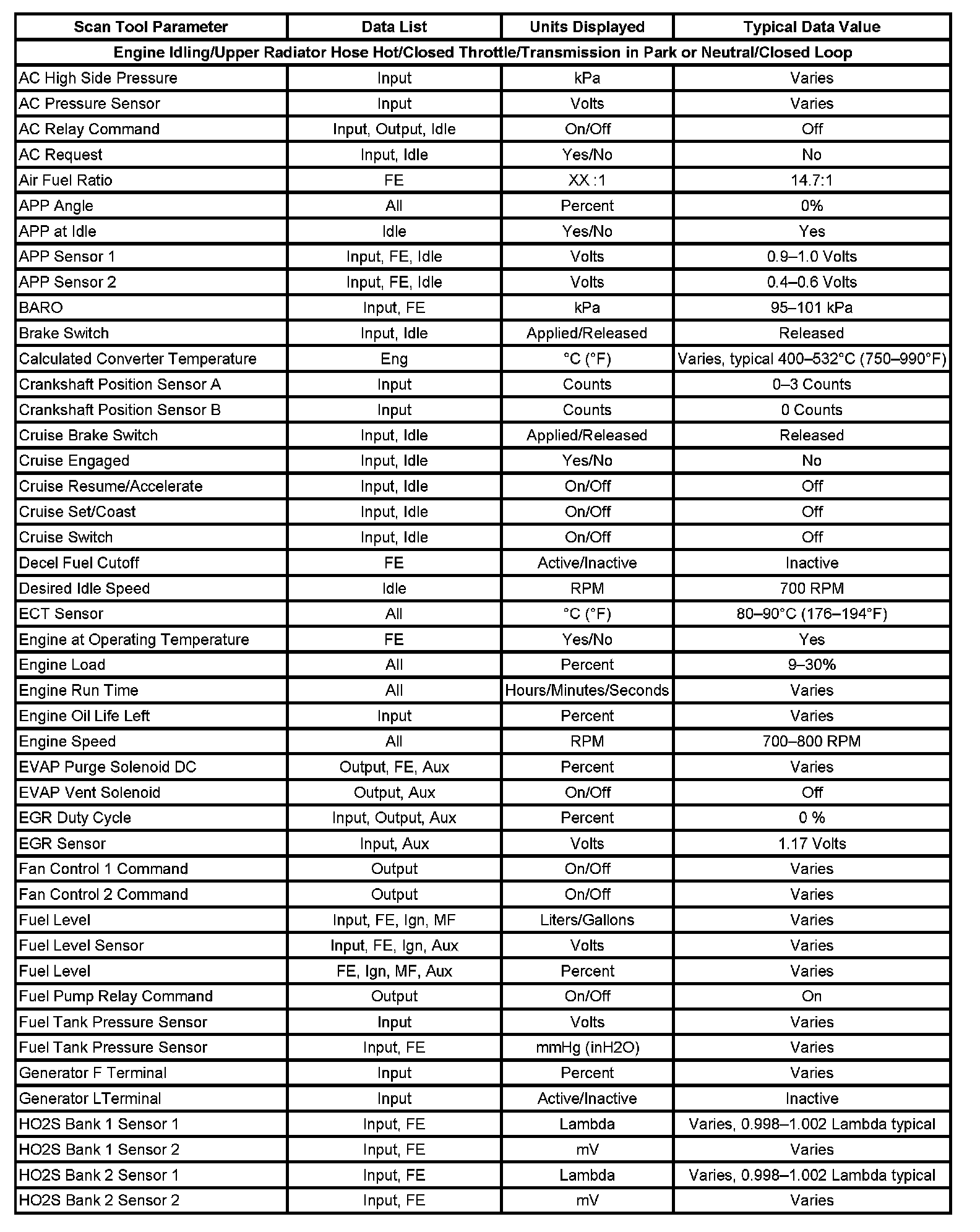 Scan tool values from a properly running engine may be used for comparison with the engine you are diagnosing. The Engine Scan Tool Data List represents the values that would be seen on a normal running engine.