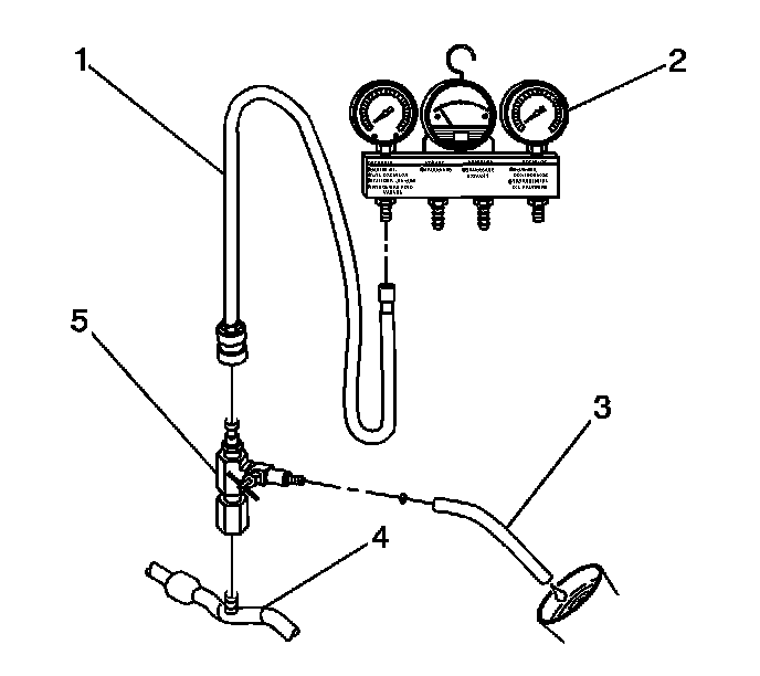 5. Connect the fuel shut off and bleed assembly (5) to the schrader valve on the fuel feed pipe (4) near the fuel rail. Use a shop towel in order to catch any remaining fuel that may leak.