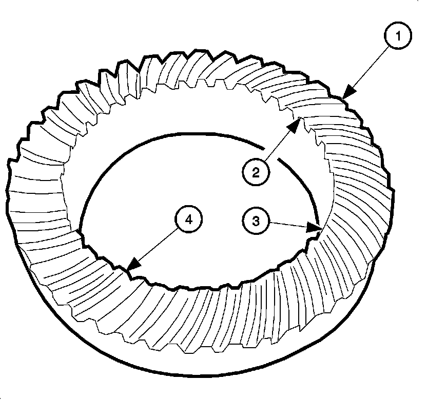 ^ The end of the gear tooth farthest away from the center of the ring gear (1) is the heel end of the tooth.