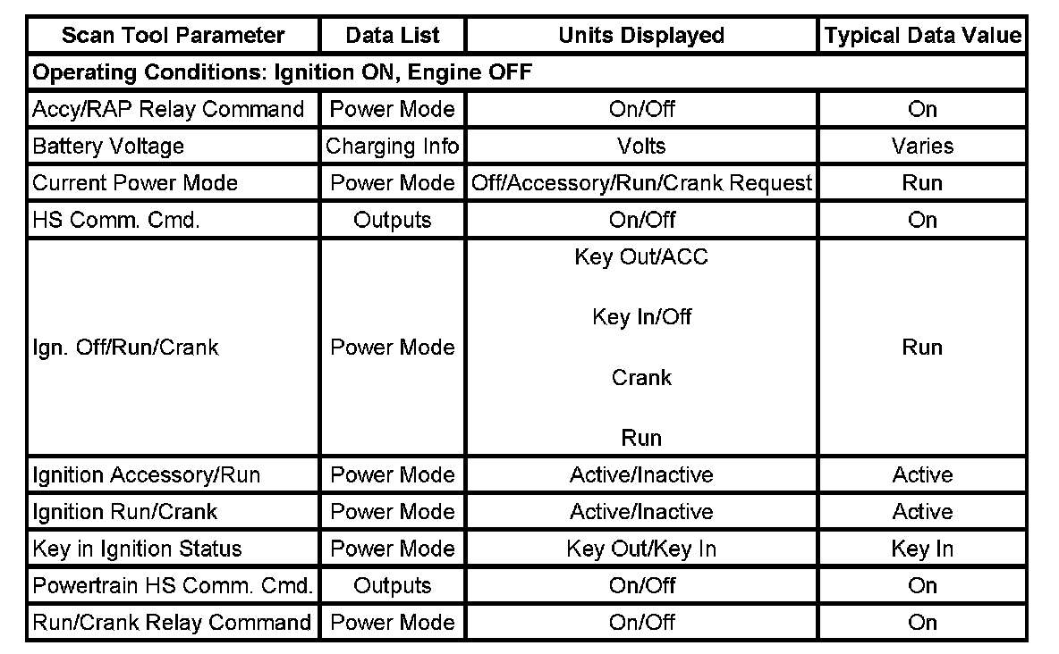 The scan tool data values were taken from a known good vehicle under the following conditions: