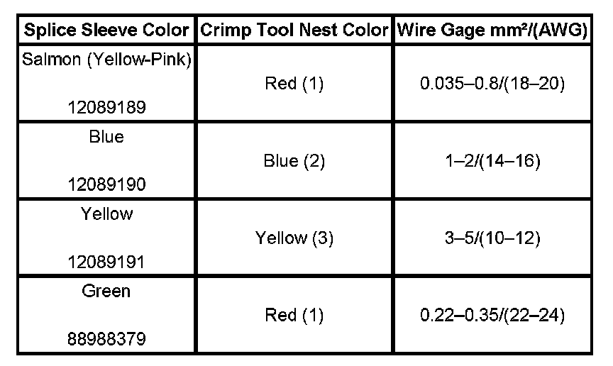 6. Select the proper DuraSeal splice sleeve according to the wire size. Refer to the above table at the beginning of the repair procedure for the color coding of the DuraSeal splice sleeves and the crimp tool nests.
