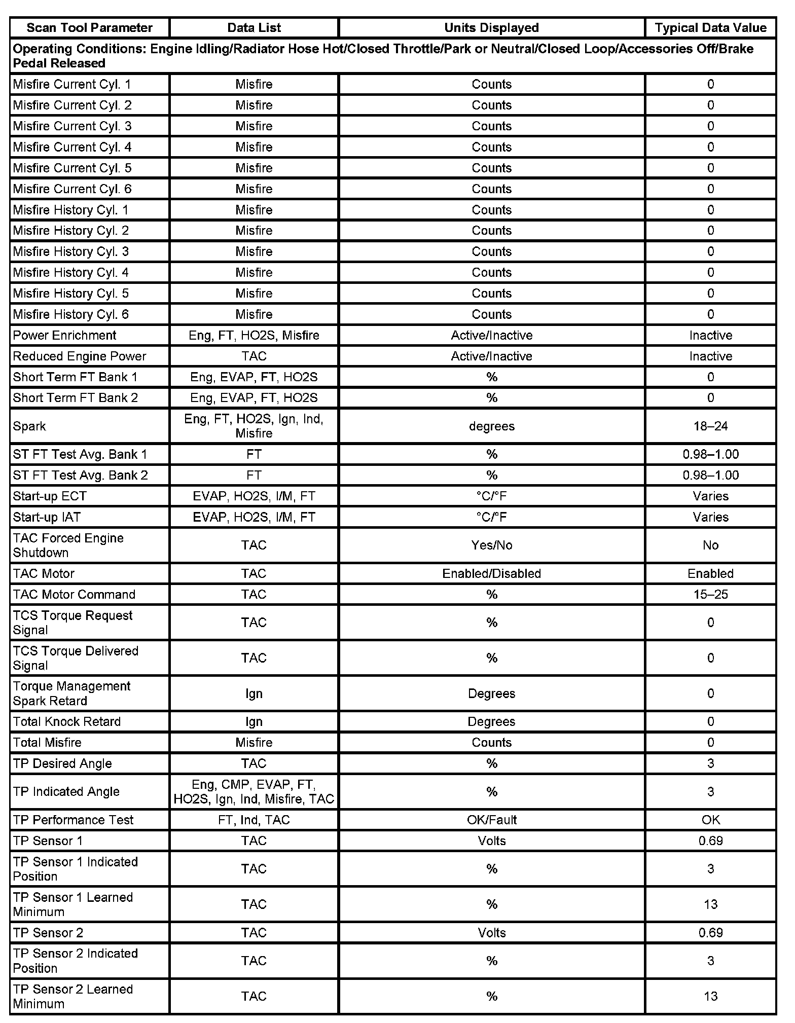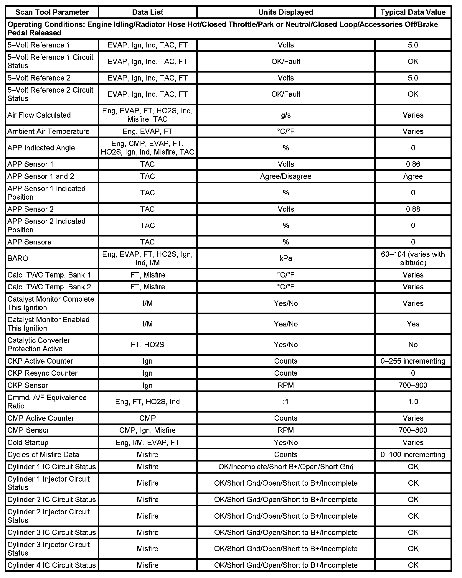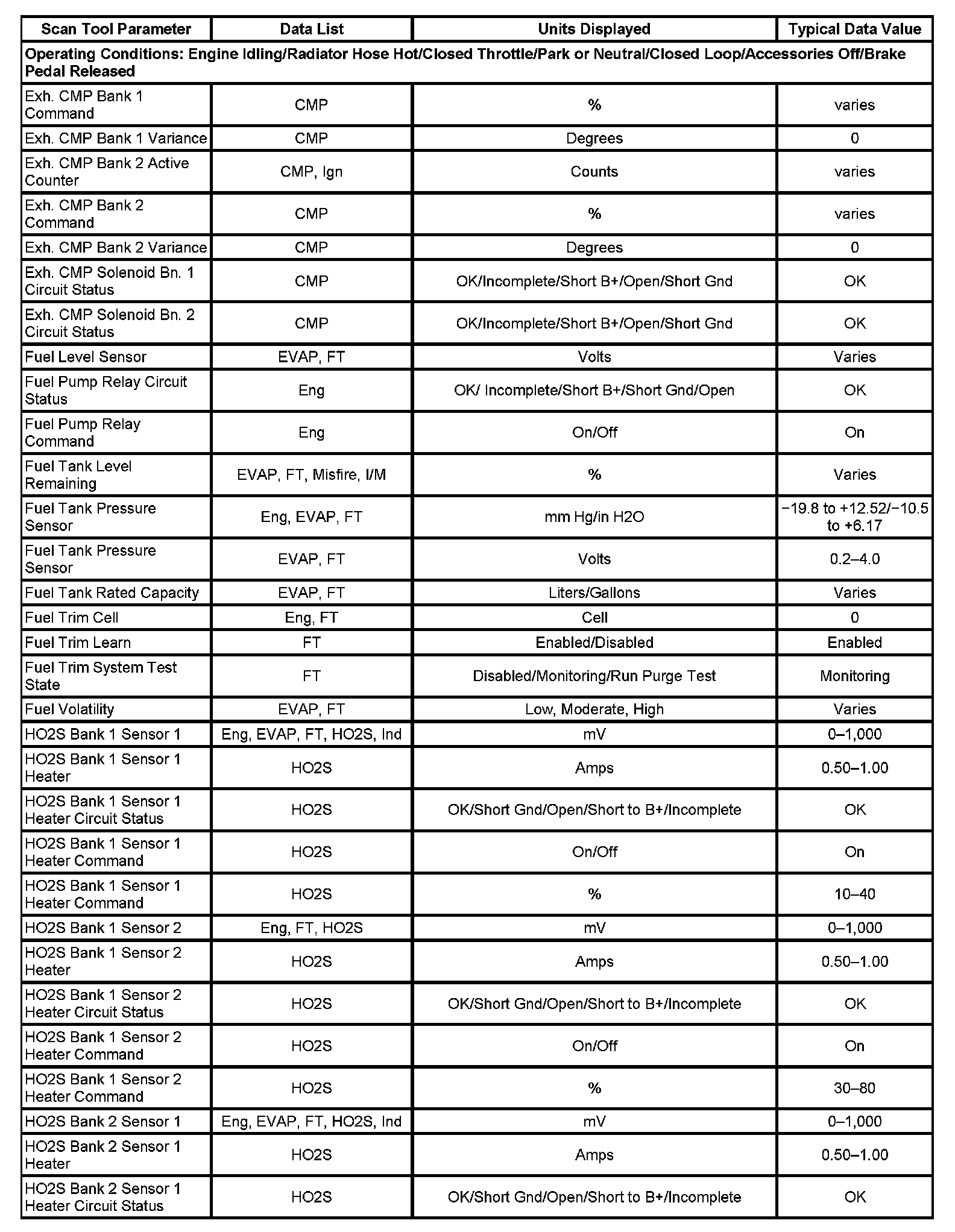 The Engine Scan Tool Data List contains all engine controls-related parameters that are available on the scan tool. The list is arranged in alphabetical order. A given parameter may appear in any one of the data lists, and in some cases may appear more than once, or in more than one data list in order to group certain related parameters together.