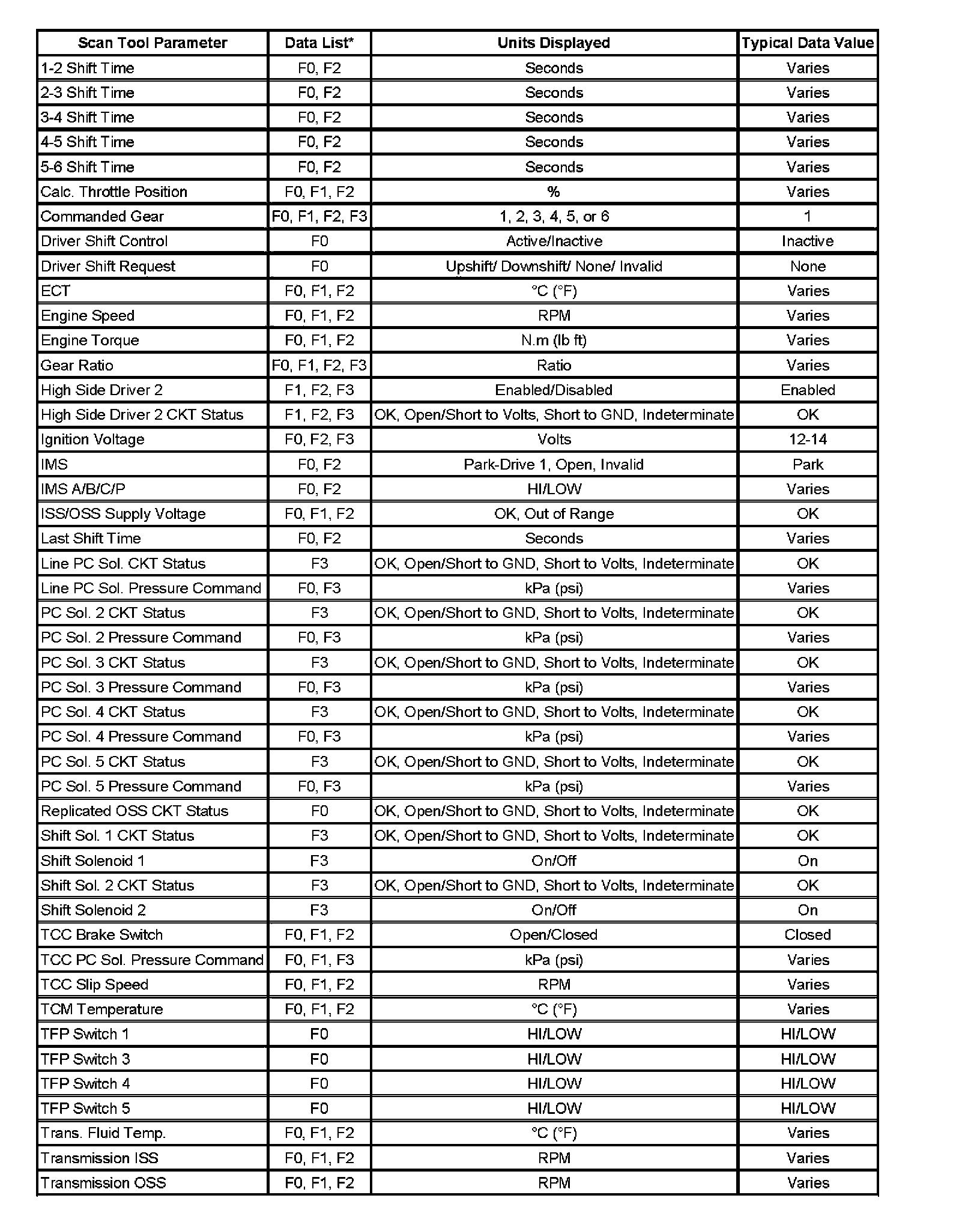 Only the parameters listed below are used in this manual for diagnosing. If a scan tool displays other parameters, the values are not recommended by General Motors for use in diagnosis.