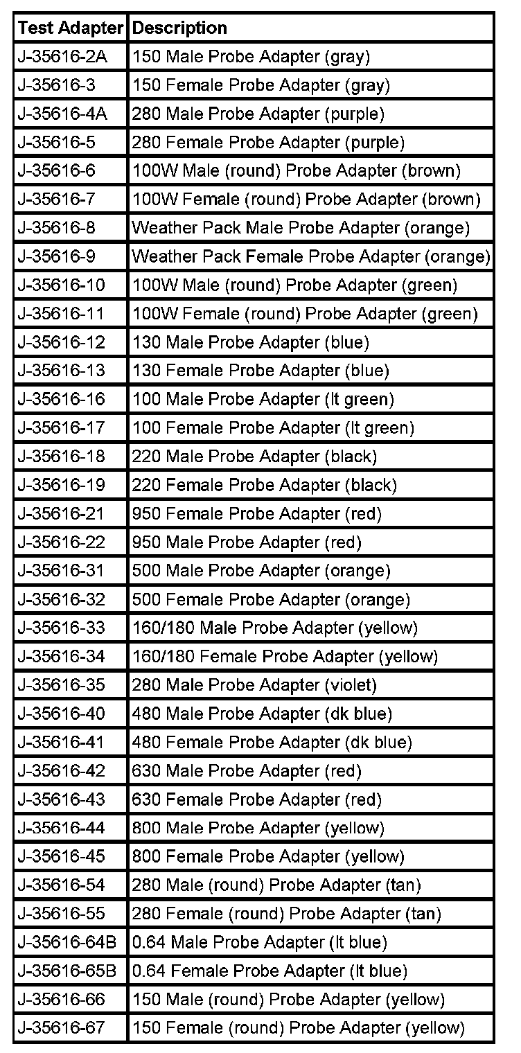 Important: When probing female 0.64 terminals, it is important to use the correct adapter. There have been some revisions to the test adapter for 0.64 terminals. The proper adapter for 0.64 terminals is the J 35616-64B which has a gold terminal and a black wire between the base and tip. Failure to use the proper test adapter may result in damage to the terminal being tested and improper diagnosis.