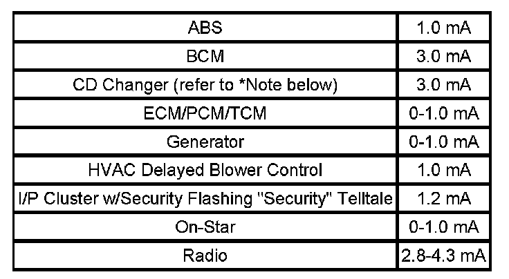 Typical parasitic load for this vehicle is 10-15 mA. If vehicle does not have one of the following components, then subtract parasitic load of component for typical parasitic load of vehicle (10-15 mA) to determine parasitic load range for vehicle being tested.