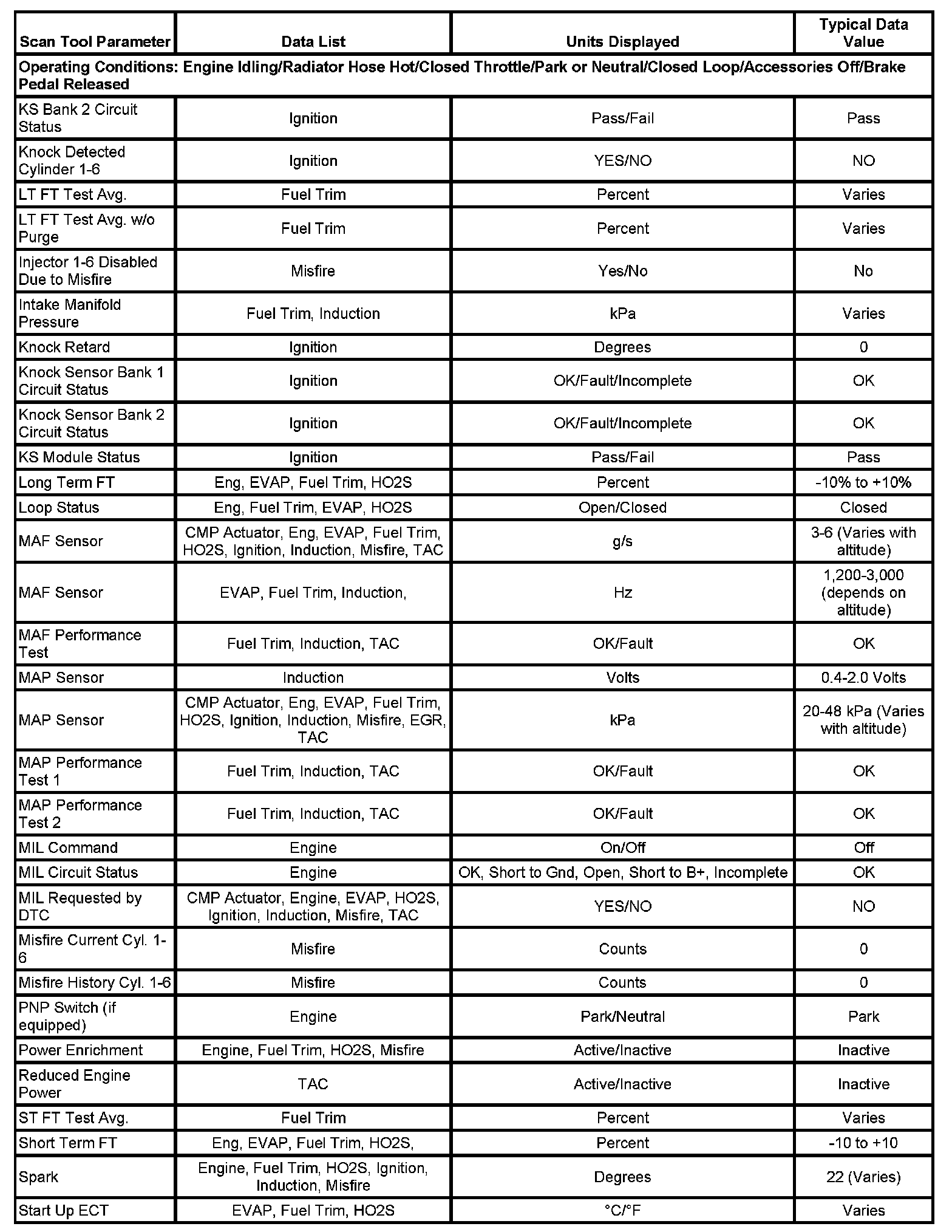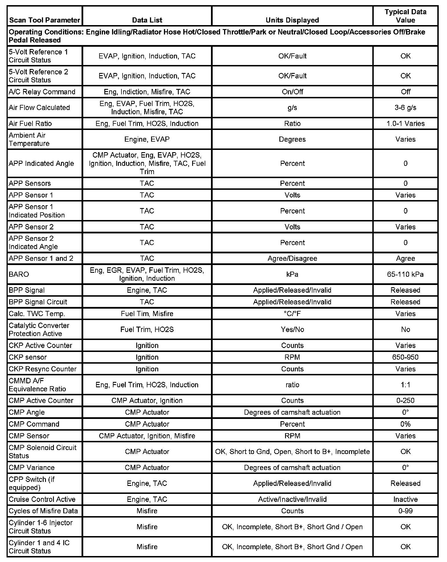 The Engine Scan Tool Data List contains all engine-related parameters that are available on the scan tool. The list is arranged in alphabetical order. A given parameter may appear in any one of the data lists, and in some cases may appear more than once, or in more than one data list in order to group certain related parameters together.