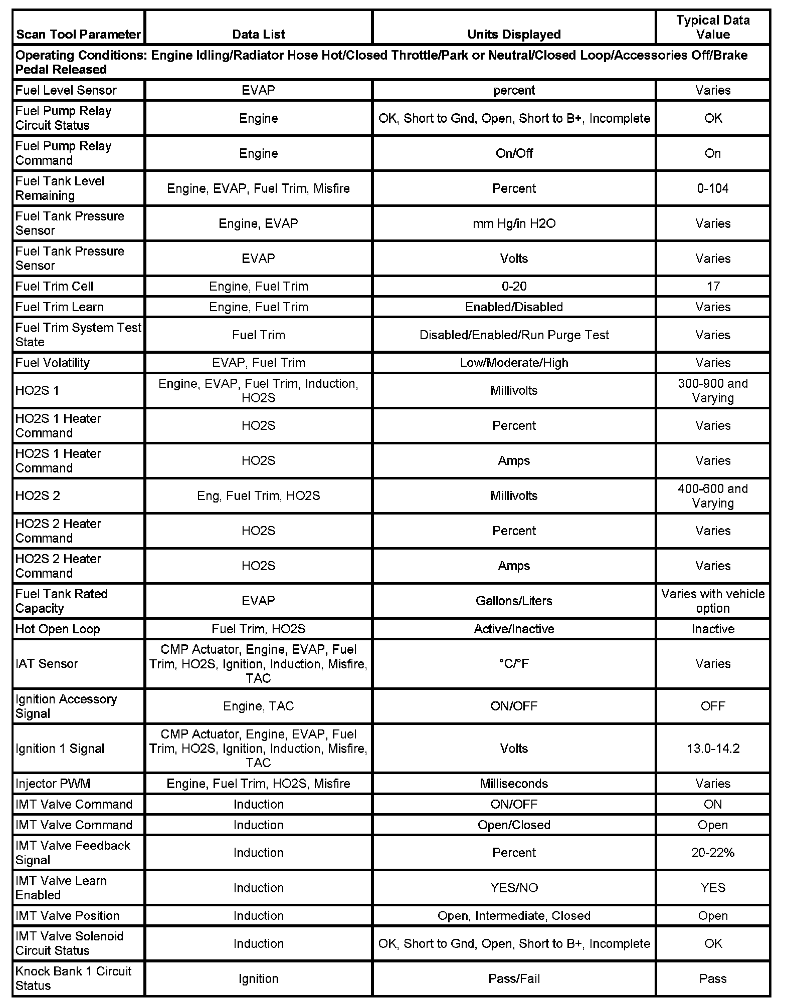 The scan tool values from a properly running engine may be used for comparison with the engine you are diagnosing. The Engine Scan Tool Data List represents values that would be seen on a normally running engine.