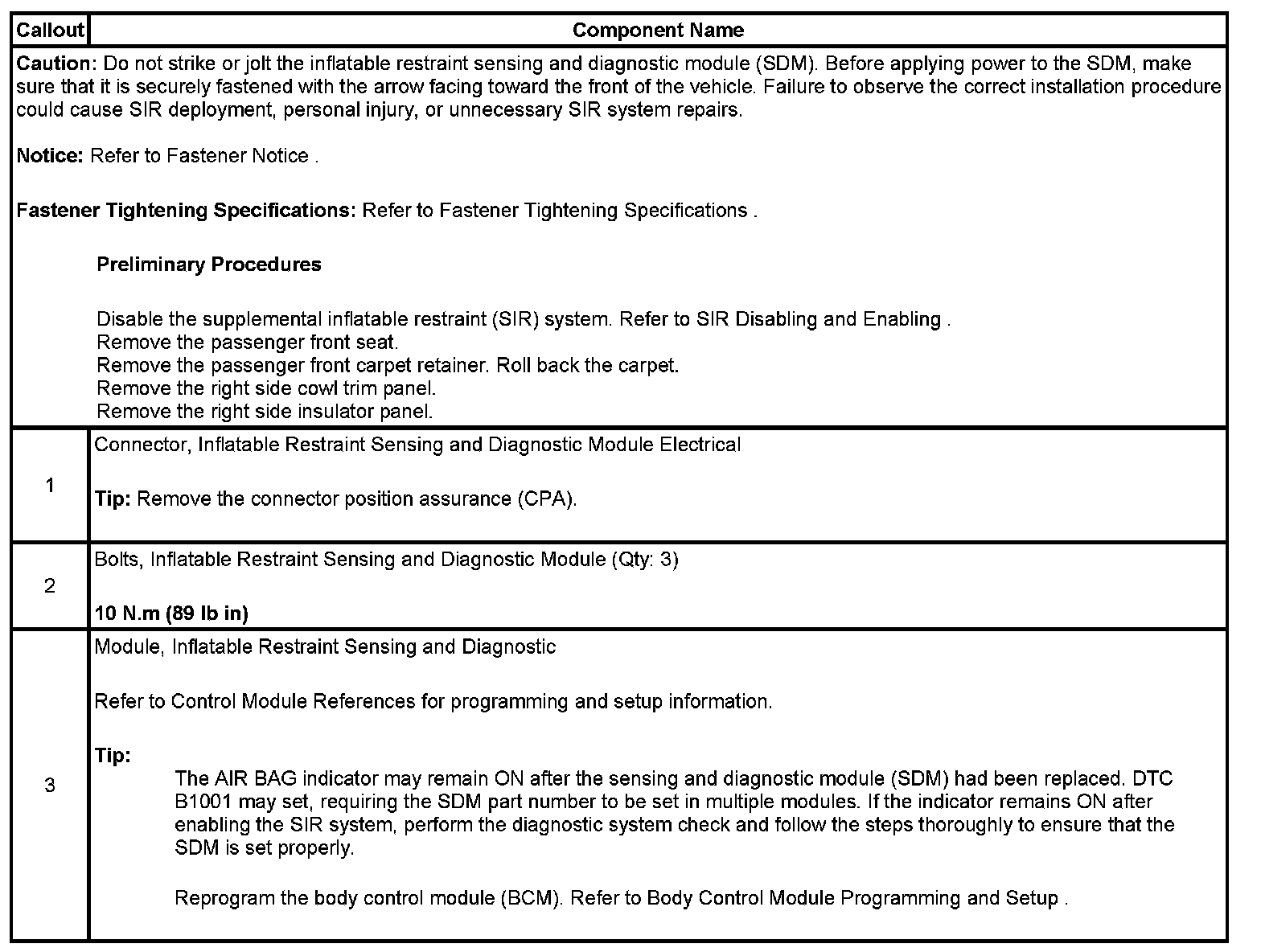 Inflatable Restraint Sensing and Diagnostic Module Replacement