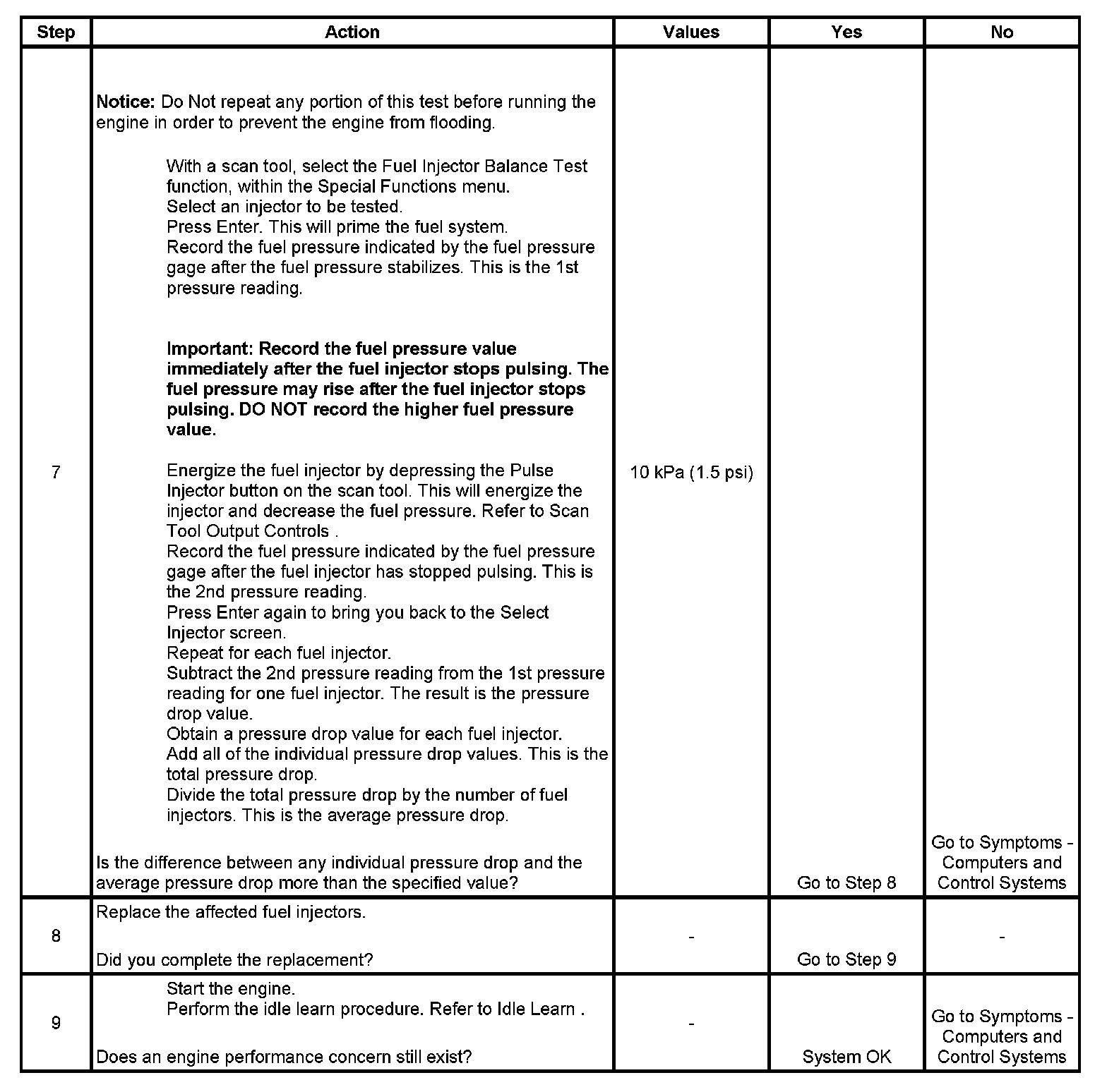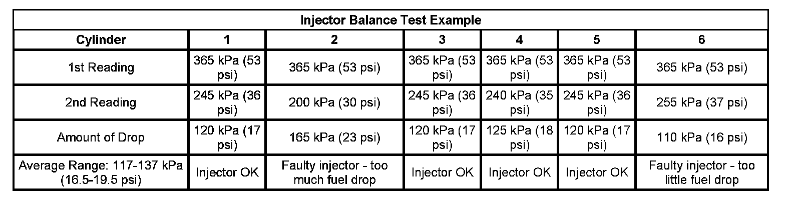 7. The fuel injectors are flowing properly if the pressure drop value for each fuel injector is within 10 kPa (1.5 psi) of the average pressure drop value. Calculate the pressure drop value for each fuel injector by subtracting the second pressure reading from the first pressure reading.