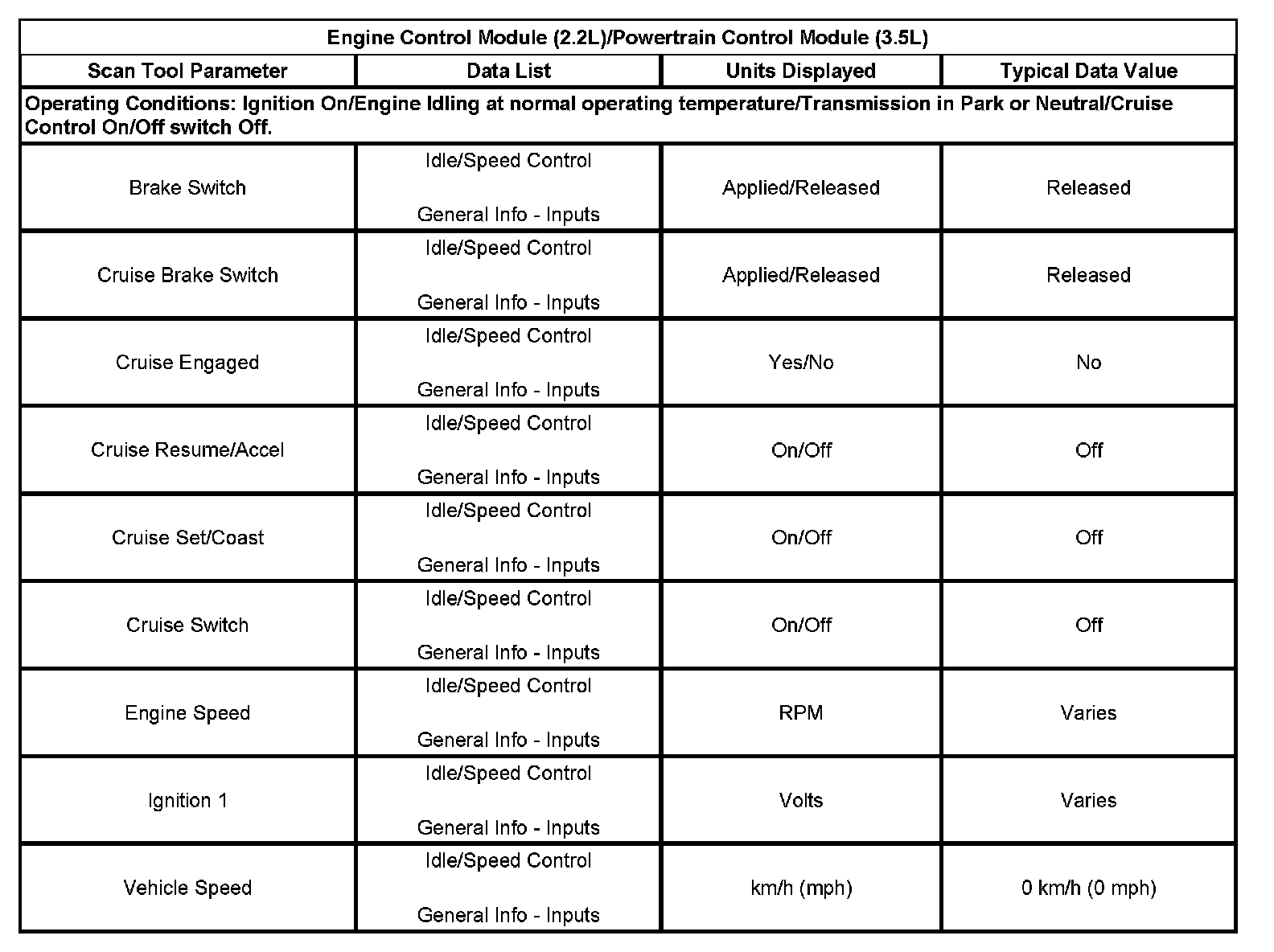 The scan tool data lists contain all of the cruise control related parameters that are available on the scan tool. The parameters in the list are arranged in alphabetical order. The data list column indicates the location of the parameter within the scan tool menu selections.