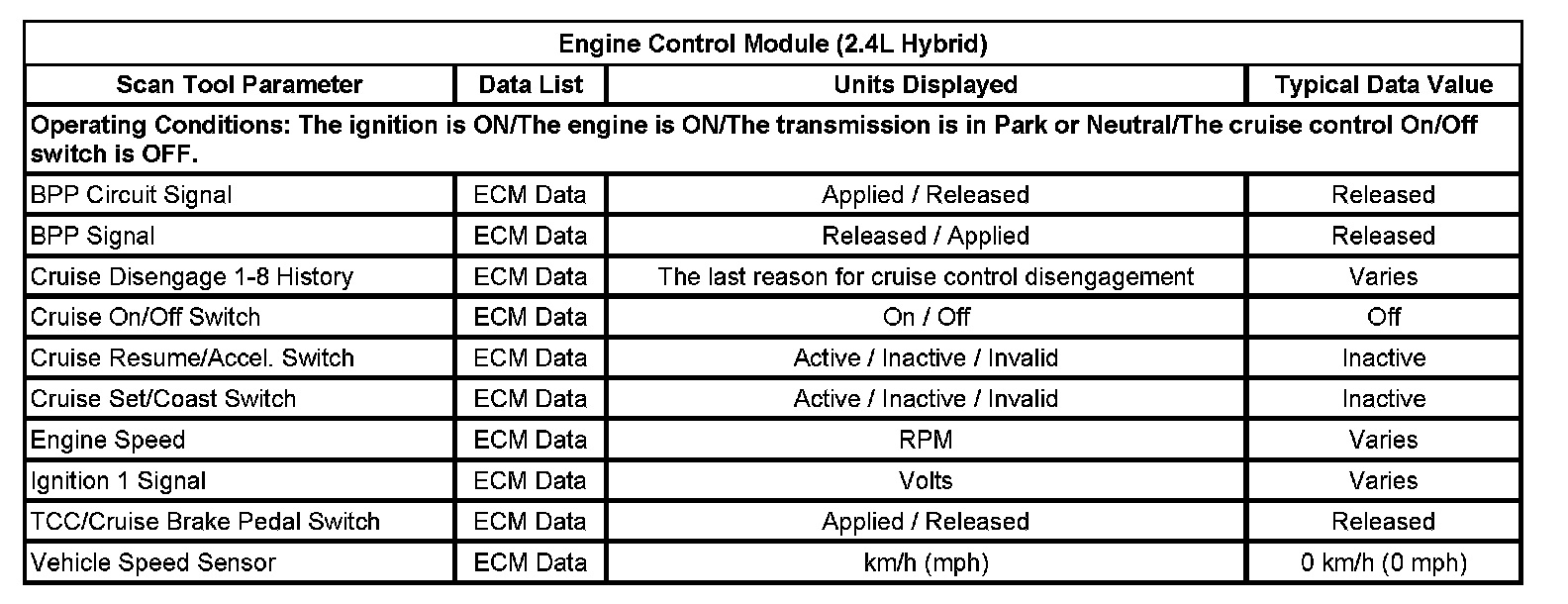 The typical data values are obtained from a properly operating vehicle under the conditions specified in the first row of the scan tool data list table. Comparison of the parameter values from the suspect vehicle with the typical data values may reveal the source of the customer concern.